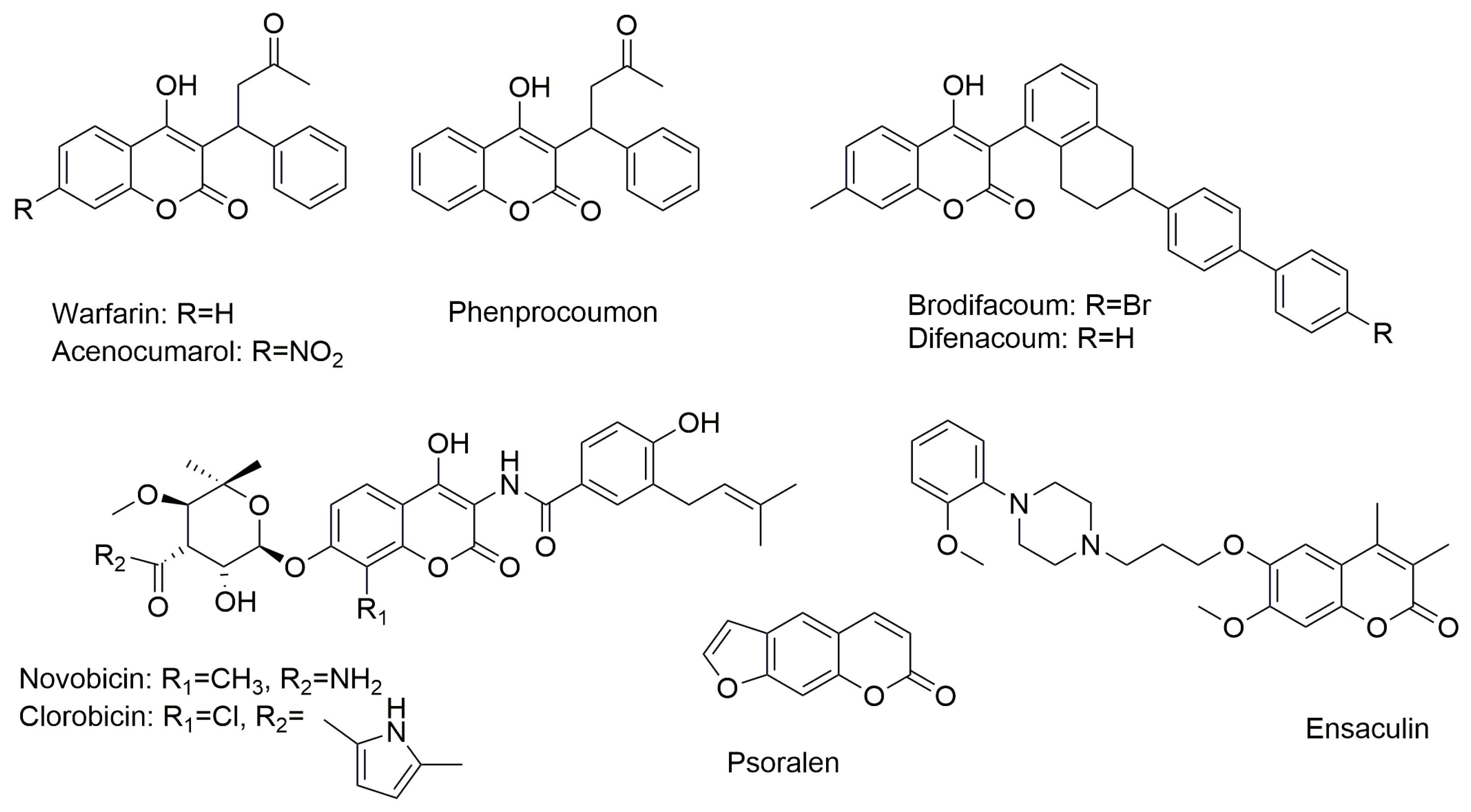 - Bhagat, P.P.; Bansode, T.N. Coumarin Derivatives: Pioneering New Frontiers in Biological Applications. Cur. Org. Chem. 2024, 29, 794–813. [Google Scholar] [CrossRef]