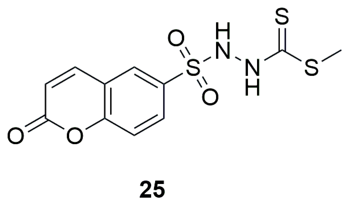 - Mangasuli, S.; Patil, B.R.; Patil, S.; Basanagouda, M.; Kulkarni, M.V.; Biradar, D. Design, Synthesis and Antimicrobial Evaluation of Some New Coumarin Dithiocarbamate Derivatives. J. Heterocycl. Chem. 2018, 55, 1644. [Google Scholar]