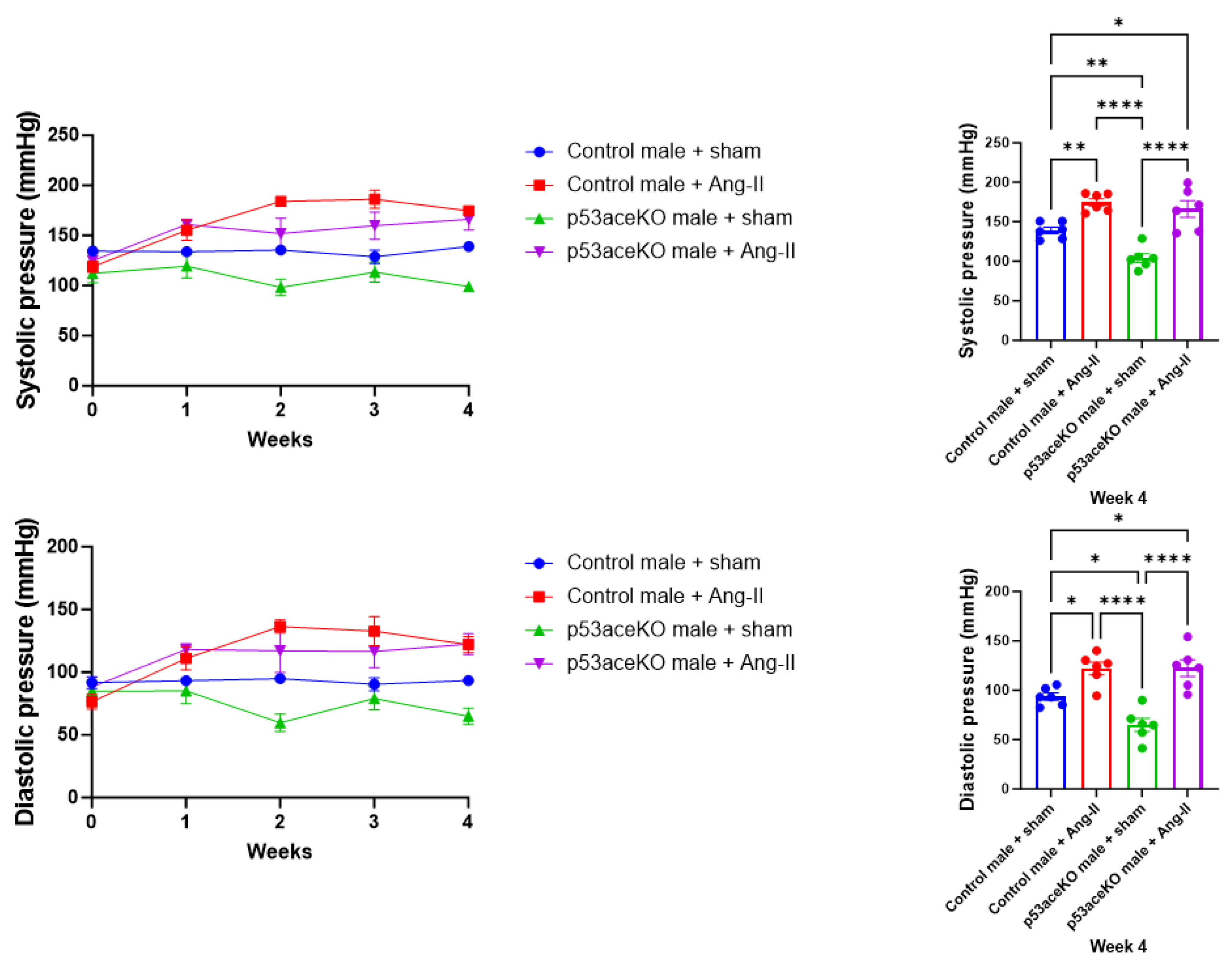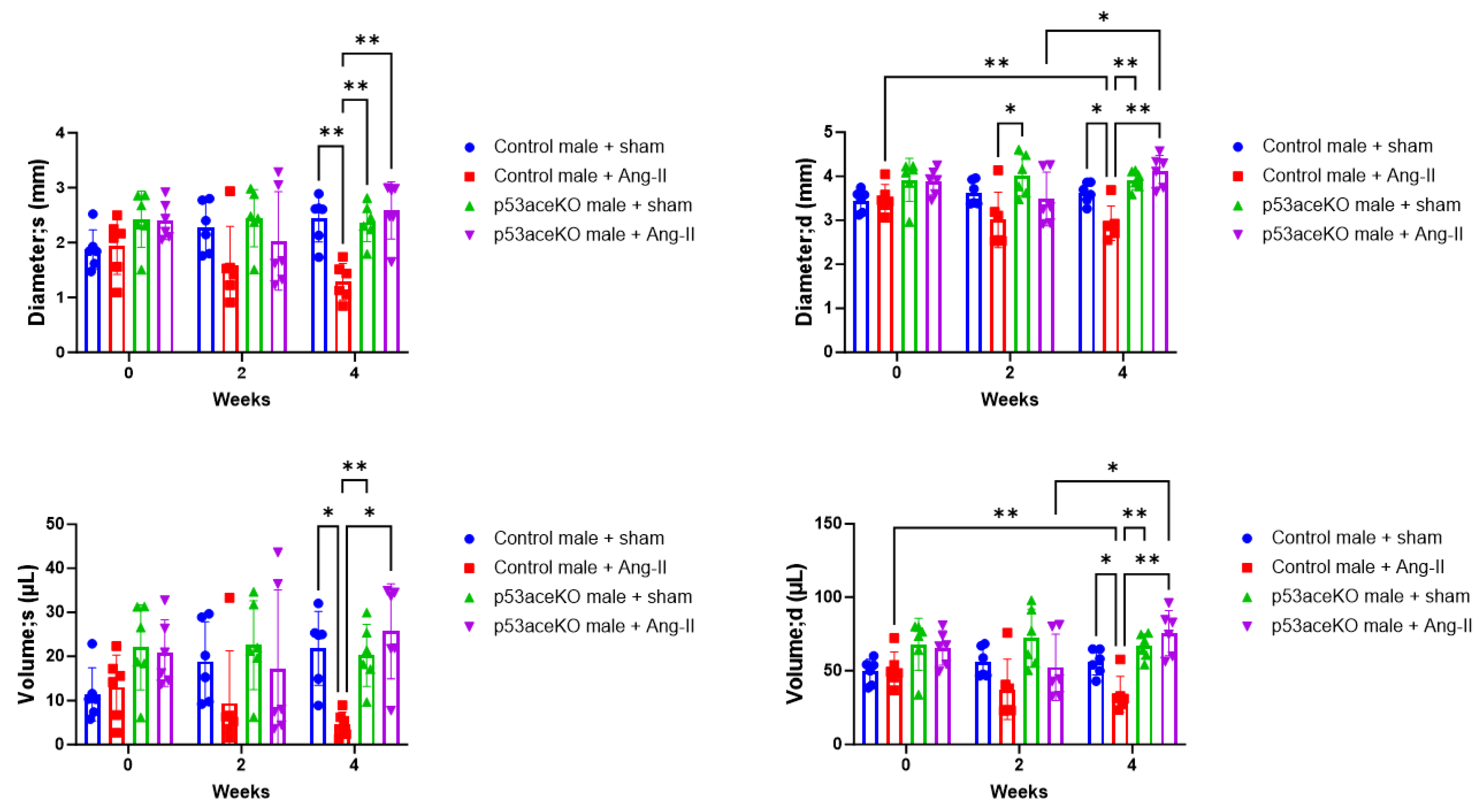 Con + Sham | Con + Ang-II | pKO + Sham | pKO + Ang-II | Control + Sham v p53aceKO + Sham | Control + Sham v Control + Ang-II | p53aceKO + Sham v p53aceKO + Ang-II | |