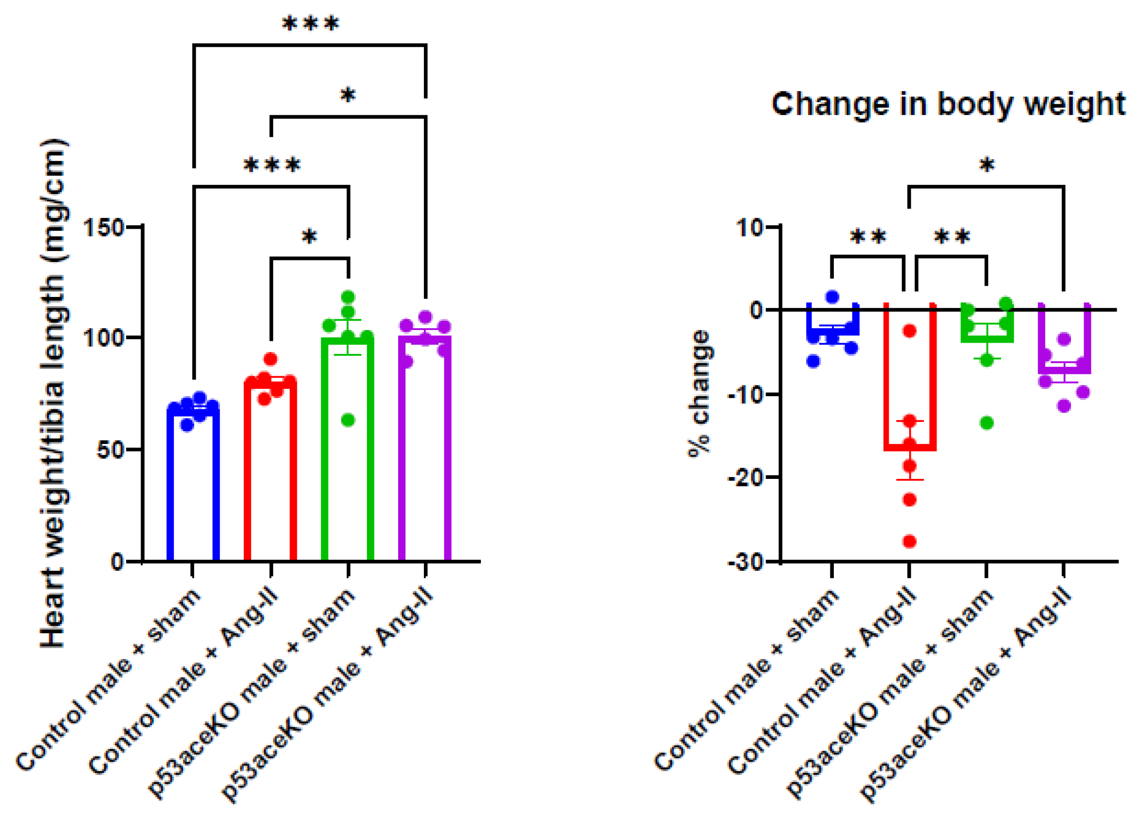 2.2. p53aceKO Mice Have a Higher Heart Weight-to-Tibia Length Ratio at Baseline and Lose Less Weight over the Course of Ang-II Infusion than Control Mice