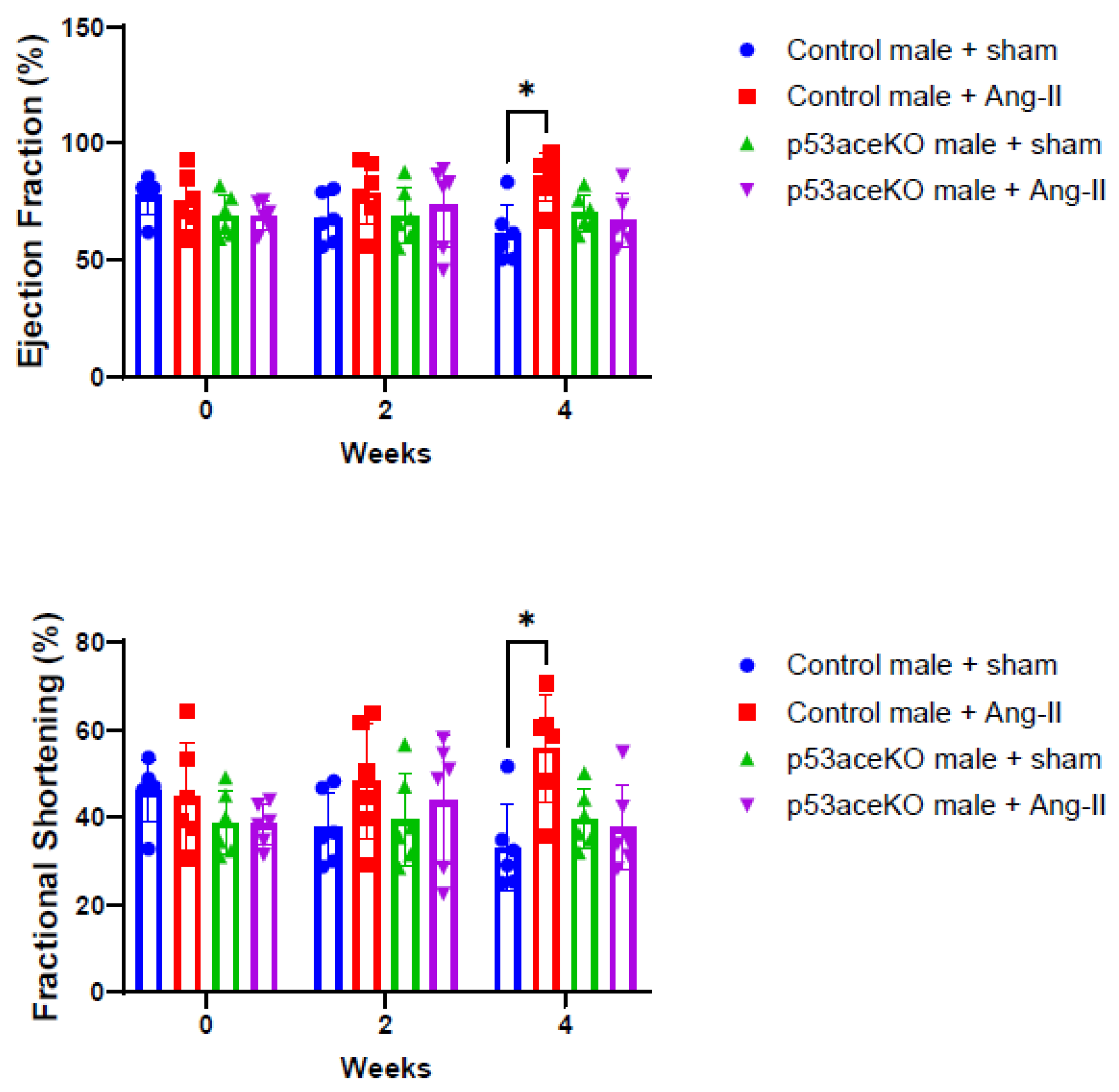 2.3. p53aceKO Mice Do Not Exhibit the Ang-II Infusion-Induced Alterations in Cardiac Function Seen in Control Mice