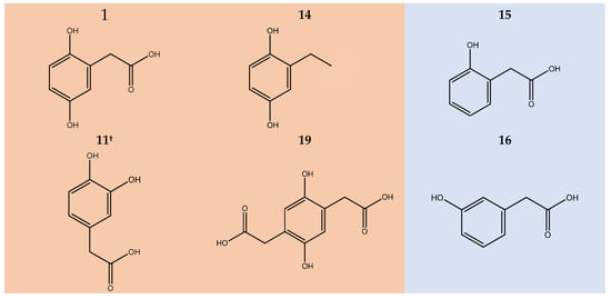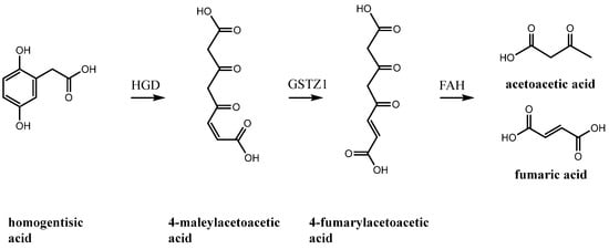 - Fernández-Cañoń, J.M.; Peñalva, M.A. Molecular Characterization of a Gene Encoding a Homogentisate Dioxygenase from Aspergillus Nidulans and Identification of Its Human and Plant Homologues. J. Biol. Chem. 1995, 270, 21199–21205. [Google Scholar] [CrossRef] [PubMed]