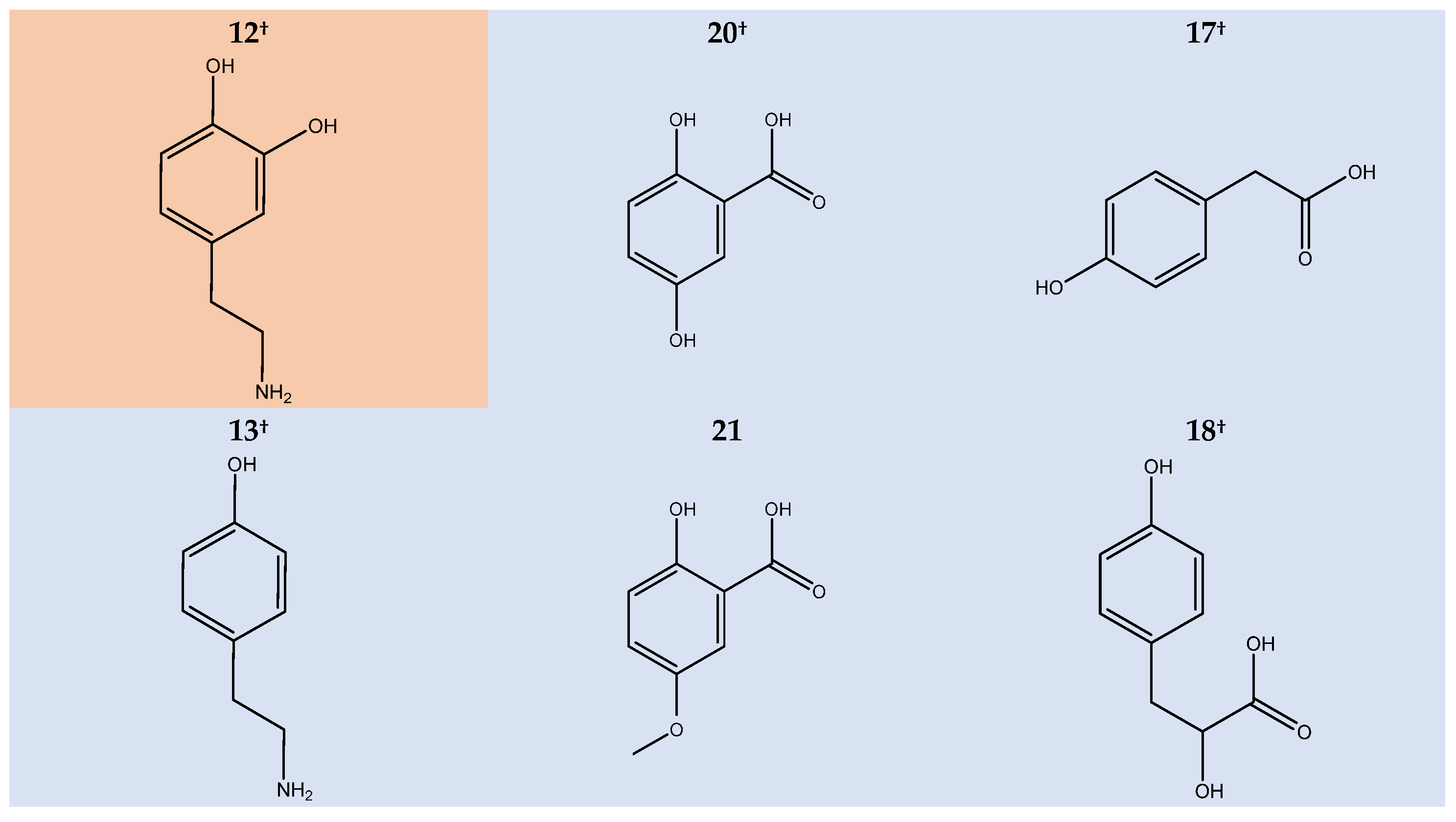 - Bernini, A.; Petricci, E.; Atrei, A.; Baratto, M.C.; Manetti, F.; Santucci, A. A Molecular Spectroscopy Approach for the Investigation of Early Phase Ochronotic Pigment Development in Alkaptonuria. Sci. Rep. 2021, 11, 22562. [Google Scholar] [CrossRef] [PubMed]