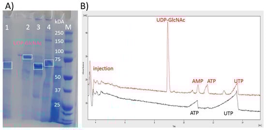 Presentation of the purity and activity of the aIBs used for synthesis of UDP-GlcNAc. (A) SDS-PAGE shows that aIBs are composed predominantly of the recombinant enzyme: 1—NahK; 2—GlmU; 3—PPK3; 4—SePPK. (B) A CE electropherogram demonstrating the activity of the aIBs. Black line—the start of the reaction with 2 mM ATP and 10 mM UTP; red line—UTP is converted into UDP-GlcNAc, 15 h of reaction. There is no residual ATP or UTP degradation activity (adenosine and uridine have peaks between the injection signal and UDP-GlcNAc).