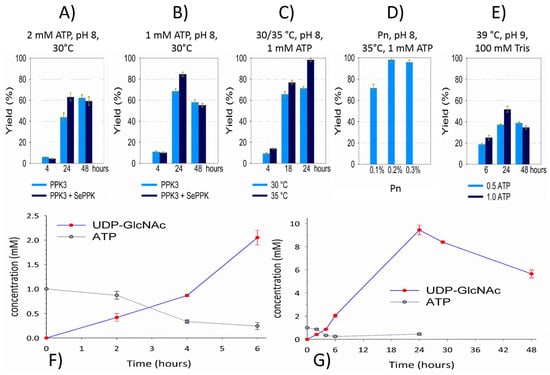 Optimization of the reaction system for UDP-GlcNAc. aIBs from 5 mg of lyophilized cells were resuspended in 250 μL of buffer. NahK (4 μL), GlmU (4 μL), PPK3 (5 μL), and SePPK (5 μL) were resuspended in a fresh reaction mixture: 50 mM GlcNAc, 10 mM UTP, 1 mM ATP, 0.2% Pn, 20 mM MgCl2, and 50 mM Tris, pH = 8. Reactions were carried out at 35 °C with shaking at 300 rpm (using a ThermoMixer C Eppendorf). Different conditions are shown in the figure (A–E). Optimization of the reaction system was performed in a volume of 100 μL (A–E) and finally in a volume of 500 μL (F,G).
