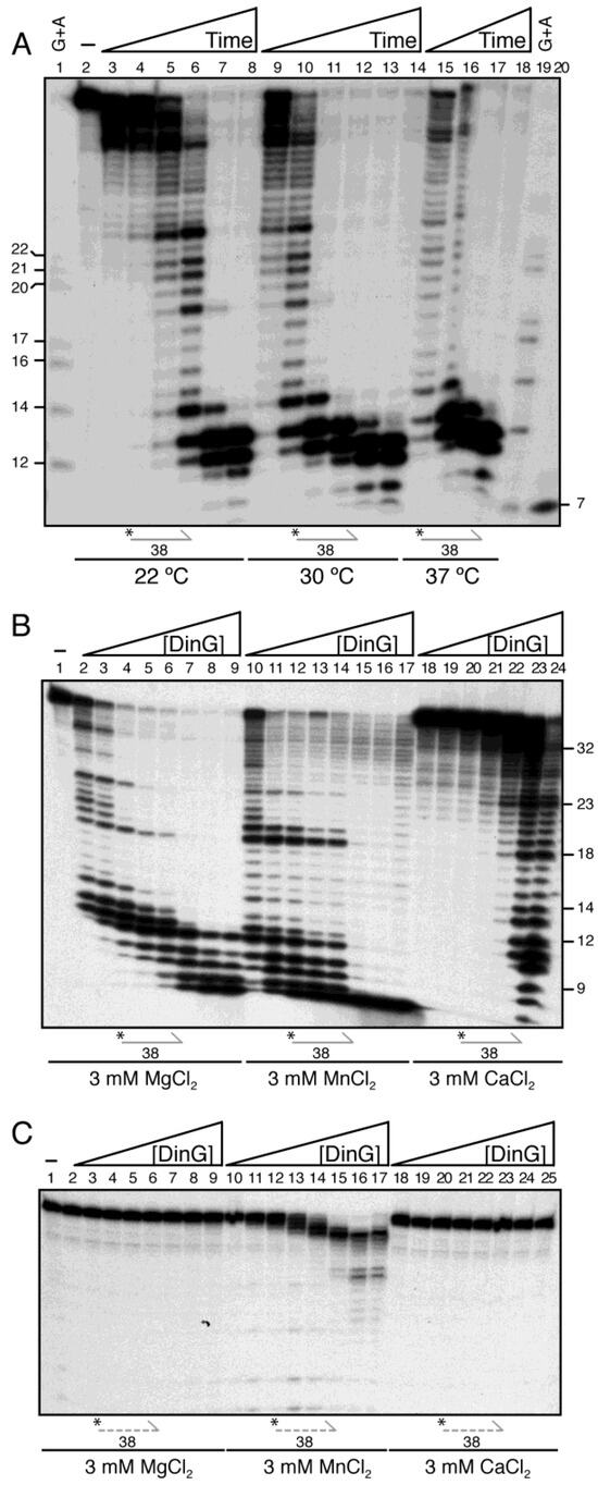 These results suggest three mechanistic insights into DinG’s nuclease activity: (i) two-phase reaction at limiting enzyme concentrations—DinG may trim a few nucleotides within 60 s at 22 °C, then likely undergoes a conformational switch that reduces dissociation and enters a low-processivity 3′⟶5 mode, producing 13 to 10 nt products (Figure 1A, lanes 3–4 vs. 7–8, and Figure 1B, lanes 2–7); (ii) at stoichiometric DinG–lssDNA ratios, protein–protein interactions may stabilise substrate binding, allowing further trimming to 8 to 6 nt products; and 6 ± 1 nt products in Mn2+ (Figure 1B, lanes 7–9 vs. 15–17); and (iii) only saturating DinG·Mn2+ degraded the γ32P-lssRNA38 substrate, albeit with low efficiency when compared with lssDNA degradation (Figure 1B vs. Figure 1C). The apparent differences between DinG and DinGSau could reflect genuine differences in substrate preference or arise from residual sequences (traces of the tobacco etch virus cleavage site) present in the DinGSau protein after His-tag removal [,].