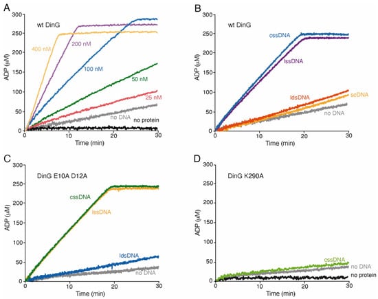 The ATPase activity of DinG, DinG D10A E12A, and DinG K290A was measured via an ATP/NADH-coupled spectrophotometric enzymatic assay, by monitoring the decrease in absorbance at 340 nm, indicative of NADH conversion to NAD, using a Shimadzu CPS-20A (Kyoto, Japan) dual-beam spectrophotometer, as described [].