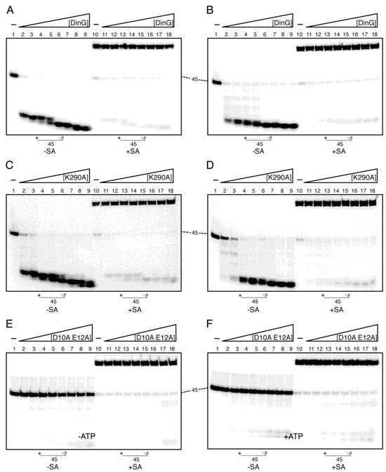 Next, we analysed whether DinG could displace SA from the 3′-end. Preformed SA-3′-Biotin γ32P-lssDNA45 complexes were generated by incubating the biotinylated substrate with a five-fold molar excess of SA, which retards the DNA on native PAGE (Figure 3A–F, lane 10). In both ATP-free and ATP-containing reactions, neither wt DinG nor DinG K290A degraded the SA-3′-Biotin γ32P-lssDNA45, although both enzymes efficiently trimmed any residual SA-free γ32P-lssDNA45 (Figure 3A–D, lanes 11–18). These results indicate that: (i) SA bound at the biotinylated 3′-end sterically prevents DinG from initiating DNA degradation; (ii) DinG, whether ATP-bound or apo, cannot displace an SA-biotin block; and (iii) exonucleolytic entry strictly requires a free 3′ terminus, suggesting that DinG recognises the 3′ end of the DNA substrate to ensure 3′→5′ exonuclease activity. While this manuscript was in preparation, it was reported that DinGSau poorly degraded a poly(dT20) substrate carrying 6-carboxfluorescein at the 3′-end [], reinforcing that DinG acts as a 3′→5′ exonuclease and is highly specific for unblocked ssDNA ends.