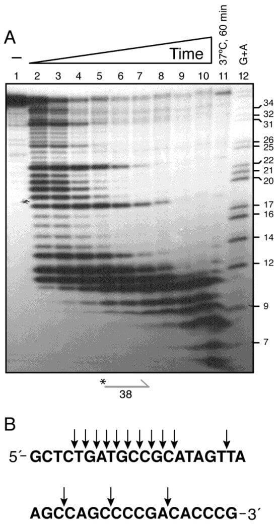 Extending this analysis, we examined two additional lssDNA substrates—a complementary 38 nt γ32P-lssDNA38c and the 3′-Biotin γ32P-lssDNA45 (Figure 3A)—under varied protein concentrations and reaction times. Denaturing gels revealed recurring intermediates spaced by ~4–5 nt: (i) 3′-Biotin γ32P-lssDNA45 yielded fragments of (42), 39, 36-35, 32, 30, 28, 27, 24, 21-20, 16, and 15-6 nt (Supplementary Figure S5A, lanes 3–11); (ii) the γ32P-lssDNA38c substrate produced bands at 33, 28, 24, 20-19 nt and final products of 12-5 nt (Supplementary Figure S5B, lanes 3–9). Analysis of the sequences at pause sites showed no enrichment for specific motifs or dinucleotides (Figure 4B and Supplementary Figure S5), indicating that pausing reflects an intrinsic 4–5 nt stepping mechanism rather than sequence-directed cleavage.