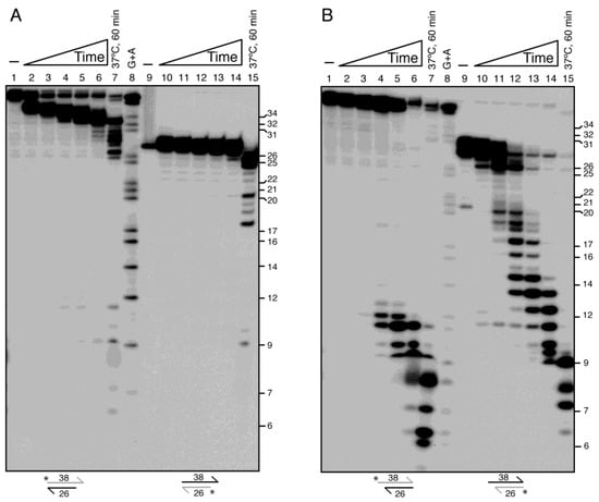 When the 5′-overhang γ32P-dsDNA38 substrate was incubated with limiting DinG, no appreciable degradation of the labelled strand from the blunt 3′-end was observed during the first 5 min. By 15 min, partial trimming yielded 11 ± 1 nt intermediates, and by 60 min >70% of the labelled strand was converted into 11 ± 2 nt products at 22 °C or 7 ± 2 nt products at 37 °C (Figure 6B, lanes 6 vs. 7). In contrast, when the bottom strand was labelled, DinG degraded >95% of the recessed γ32P-strand of the substrate within 2 min, producing intermediates ranging from 26 to 13 nt (Figure 6B, lane 12). After 60 min, final products of 11 ± 2 nt (22 °C) and 7 ± 1 nt (37 °C) accumulated (Figure 6B, lanes 12–14 vs. 15).