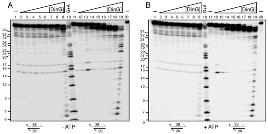 DinG is an ATP-independent exonuclease. To test whether ATP impacts degradation, parallel reactions containing 2.5 mM ATP were performed. Limiting DinG still degraded >70% of the substrate after a 5 min incubation at 37 °C, producing the same end-products as in the absence of ATP. This indicates only a slight ATP-dependent inhibition of exonuclease activity compared with the apo enzyme (Figure 3A vs. Figure 3B, lanes 2–9). By contrast, DinGSau fails to degrade lssDNA in the presence of 1 mM ATP during a 60 min reaction at 37 °C []. The molecular basis for these divergent ATP effects on DinG orthologues remains unknown.