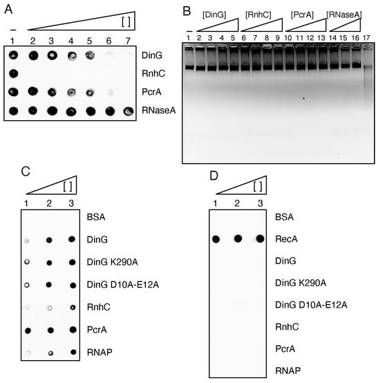 Each protein (75–300 ng) was serially diluted and spotted onto a nitrocellulose membrane. The membrane was incubated with RecA (200 ng·mL−1), extensively washed, and probed with polyclonal anti-RecA antibodies to detect retained RecA. As expected, no signal was observed for BSA (300 ng) (Figure 8C, lane 3), while PcrA (75 ng) retained RecA (Figure 8C, lane 1), confirming assay specificity. DinG and both mutant variants (150 ng each) also interacted with RecA (Figure 8C, lanes 2–3). A higher amount (300 ng) of RnhC was required to detect the interaction (Figure 8C, lane 3). The RNAP complex (150 nM) also retained RecA (Figure 8C, lane 2). To exclude antibody cross-reactivity, RecA and each test protein (75–300 ng) were separately spotted, the membrane was washed extensively and probed with anti-RecA antibodies (Figure 8D). Only RecA produced a detectable signal, confirming that the observed signals belong to RecA.