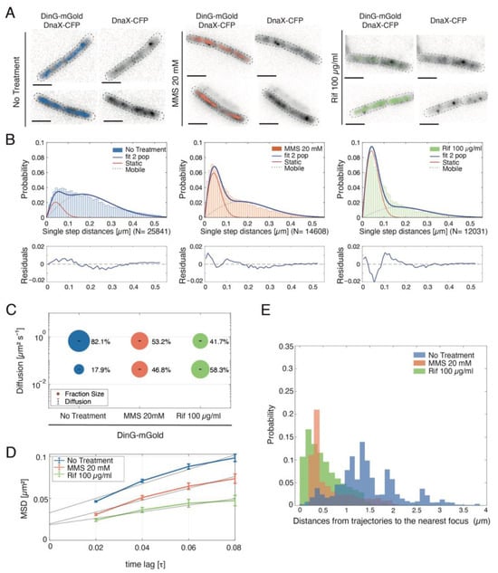 Single-molecule tracking of DinG-mGold. (A) Live-cell analysis of treated (MMS (red) or Rif (green)) or untreated (blue) cells. Representative images of DnaX-CFP localisation and overlaid tracks of DinG-mGold in B. subtilis, either untreated or after treatment. (B) Jump distance analysis shows the probability of displacements: solid red lines represent the static subpopulations, dashed blue lines the mobile fraction, and solid blue lines the sum of both subpopulations. (C) Bubble plots comparing fraction sizes (bubble size) and diffusion constants (y-axis) under different conditions. A simultaneous fit was applied, to show that changes in molecule dynamics are reflected in changes in populations sizes rather than in different diffusion constants. Step-size distributions reveal two populations for each condition: a mobile (upper circles) and a static (lower circles) fraction. (D) Mean squared displacement analyses assuming a single population model. (E) Histogram showing the distances of DinG-mGold trajectories from DnaX-CFP in 50 cells under each condition.