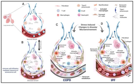 Schematic representation of alveolar alterations during normal, reversible, and irreversible lung damage in COPD and IPF progression. Panels (A,B) depict healthy alveolar architecture and a moderately stressed state, respectively. Under mild injury, immune cell infiltration may support tissue repair, allowing for reversibility. In contrast, panels (C,D) illustrate irreversible damage observed in advanced COPD and IPF, respectively. COPD progression is characterized by alveolar epithelial cell loss and emphysematous changes driven by SASP-associated senescence and endothelial dysfunction. In IPF, fibroblast accumulation and excessive collagen deposition dominate the pathology. Addressing both epithelial damage and fibrotic remodeling remains a significant therapeutic challenge in chronic lung diseases.