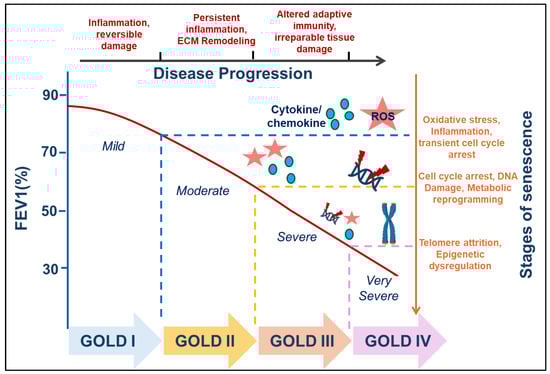 The role and extent of cellular senescence in COPD appear to vary based on disease severity and clinical phenotype. While systemic factors capable of inducing senescence are present across all stages of COPD, accumulating evidence suggests that the burden of senescent cells in the lung correlates with disease progression and severity (Figure 2).