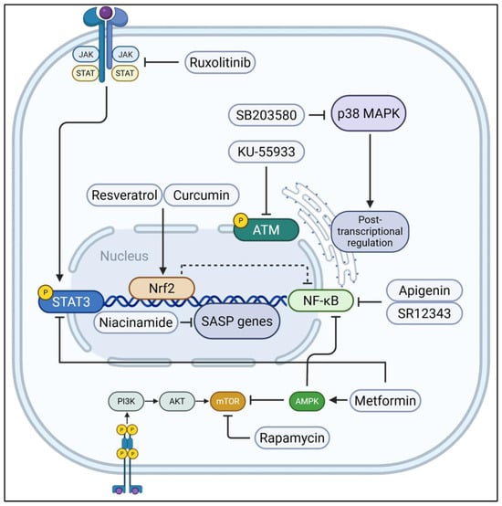 Here, we briefly summarize the molecular mechanisms underlaying the induction and maintenance of cellular senescence. The induction and maintenance of cellular senescence are orchestrated by a complex network of molecular pathways activated in response to diverse intrinsic and extrinsic stressors, including telomere attrition, DNA damage, and oncogenic signaling [,,]. Such stresses signals ultimately converge on tumor suppressor networks that enforce a durable cell cycle arrest [,]. Among these, the DDR represents a central and historically pivotal mechanism, particularly in the theme of replicative senescence, where progressive telomere shortening activates the DDR and triggers downstream effectors [,]. This response primarily engages two key tumor suppressor pathways: the p53/p21Cip1/Waf1 axis and the p16Ink4a/ Rb pathway. Together, these signaling cascades reinforce and stabilize the senescent phenotype by halting cell cycle progression and preventing proliferation of damaged cells [,]. In addition to canonical DDR-mediated senescence, alternative mechanisms such as mitochondrial dysfunction, epigenetic regulation have also been implicated. Specifically, metabolic stress, histone modifications, and imbalances in NAD+/NADH ratios can induce a senescence program characterized by altered energy metabolism and a distinct SASP profile [,,].