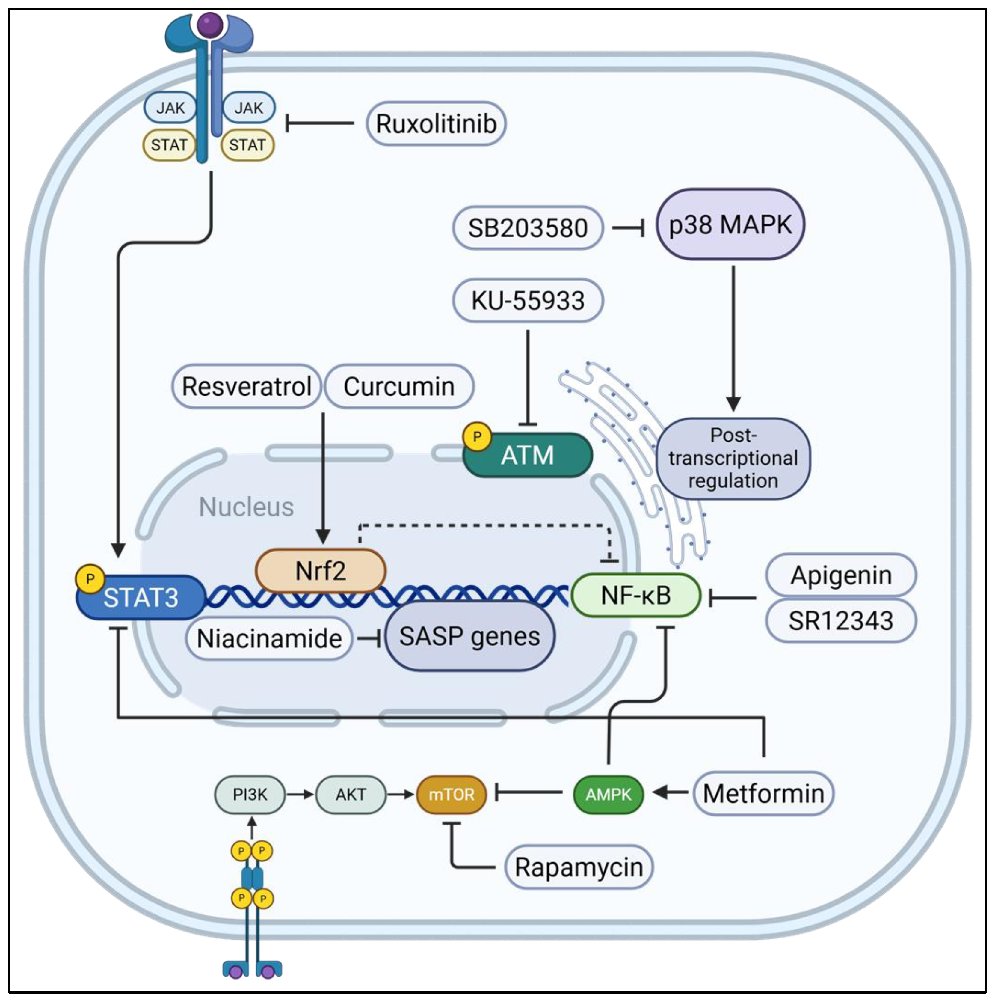 | NF-κB/JAK–STAT/mTOR | Canonical inflammatory and growth pathways that regulate SASP composition and intensity. |