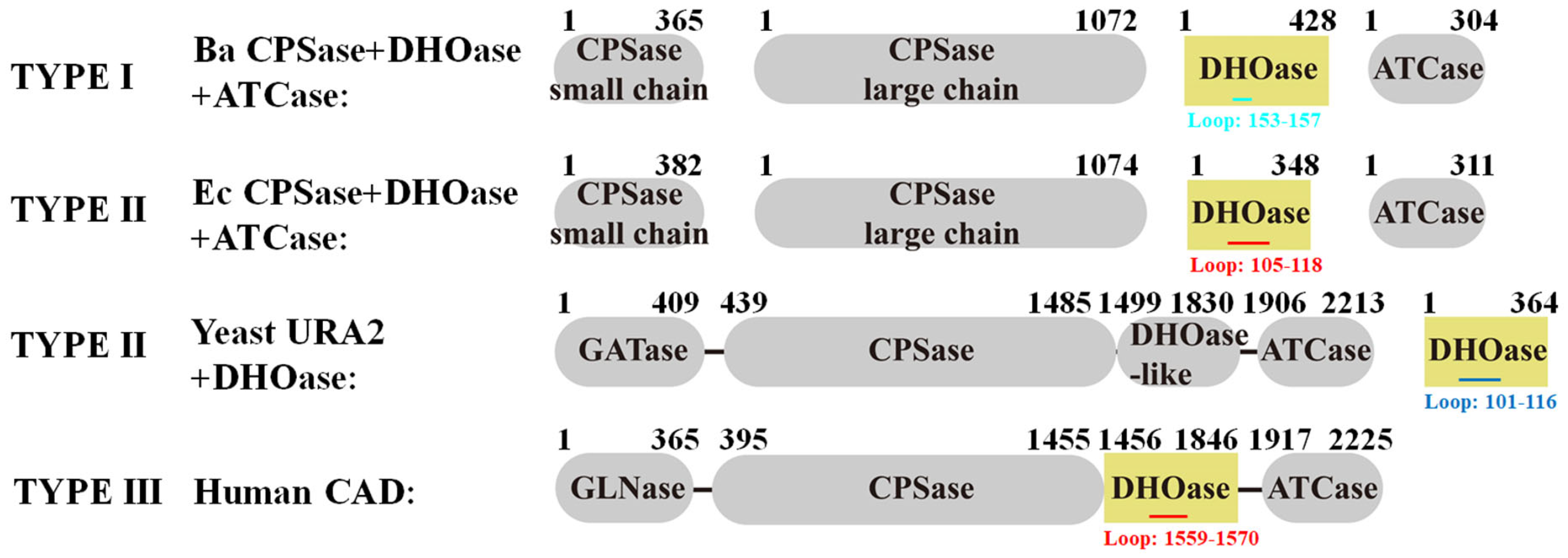 - del Caño-Ochoa, F.; Ramón-Maiques, S. Deciphering CAD: Structure and function of a mega-enzymatic pyrimidine factory in health and disease. Protein Sci. 2021, 30, 1995–2008. [Google Scholar] [CrossRef] [PubMed]