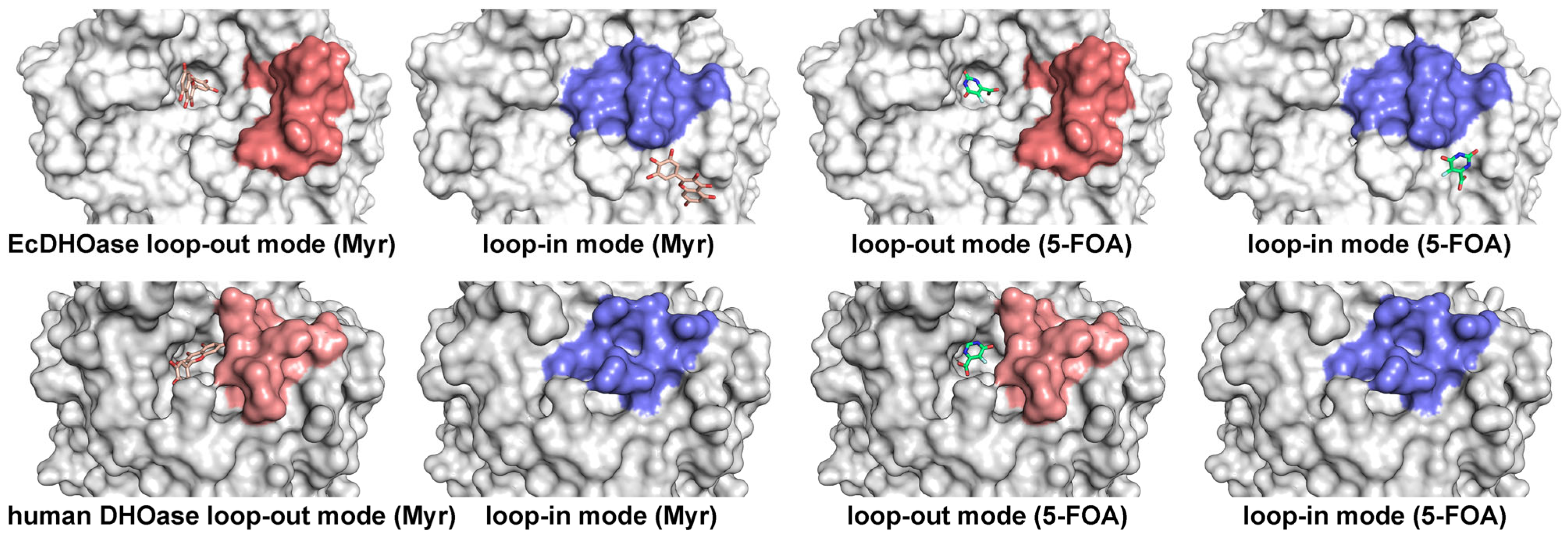 2.4. Docking Analysis of Myricetin and 5-FOA to DHOases Exhibiting Both Loop-In and Loop-Out Conformations