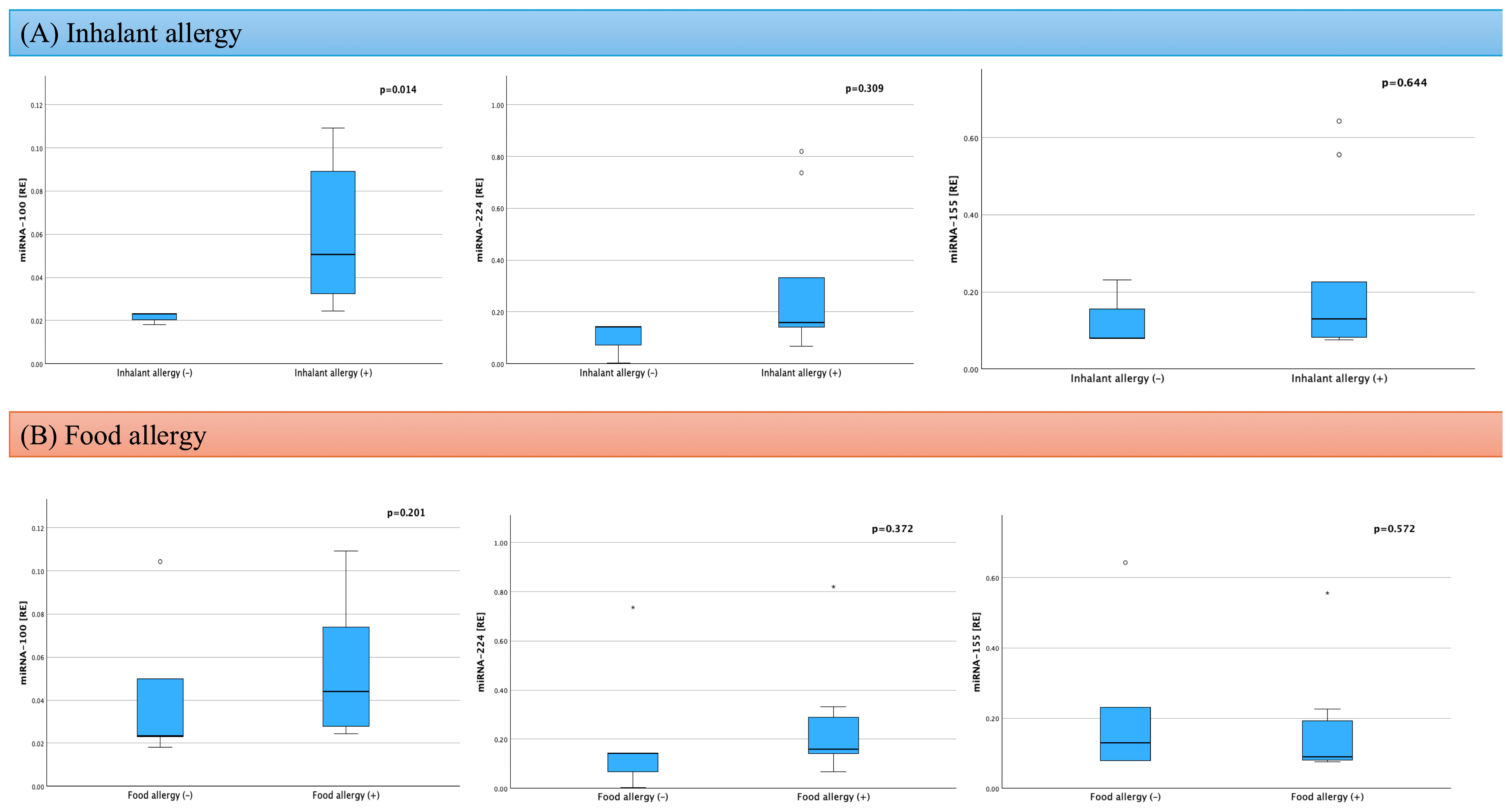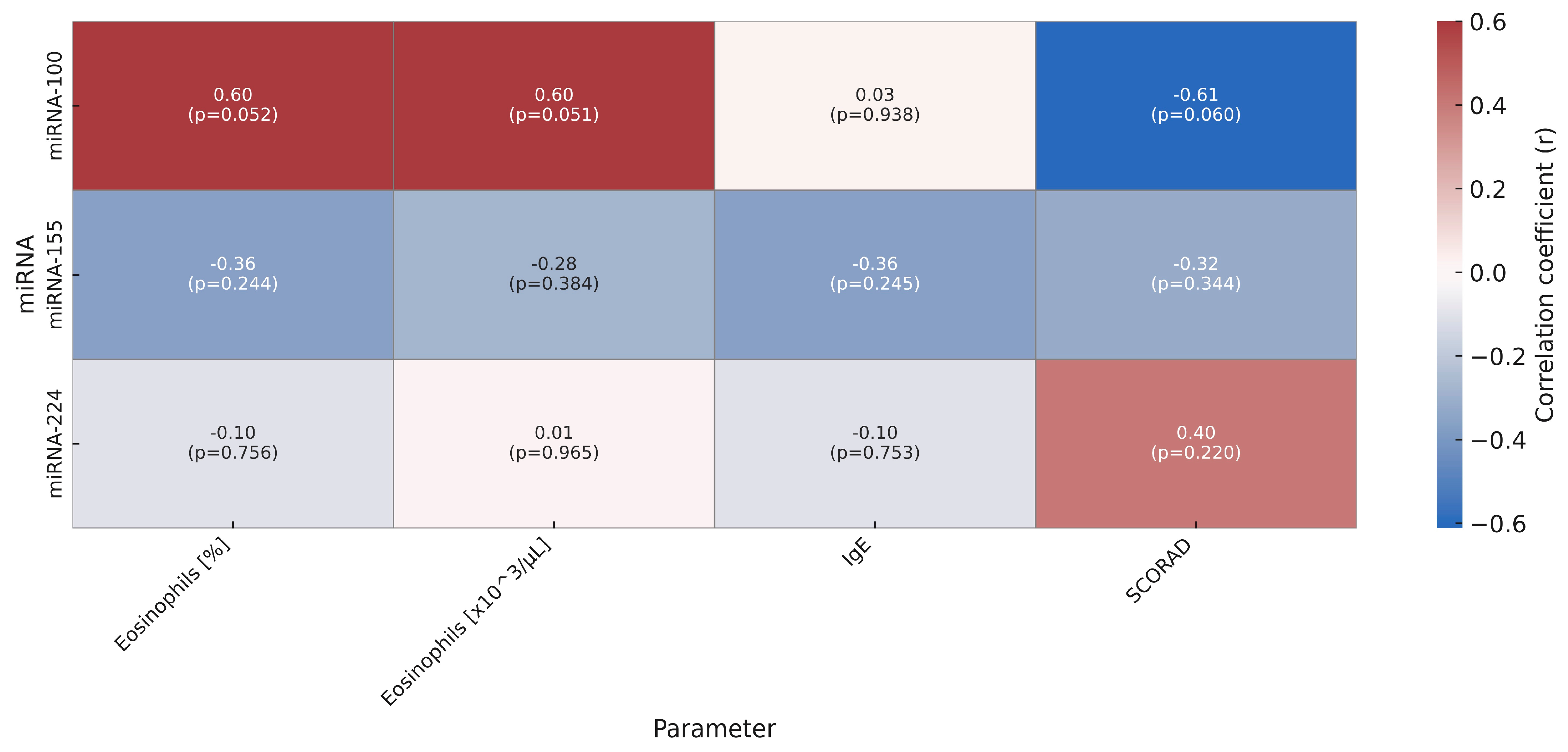 - El-Korashi, L.A.; Nafea, O.E.; Nafea, A.E.; Elkholy, B.M.; Elhawy, L.L.; Abdelhadi, A.A. MicroRNA-155 is a potential predictive tool for atopic dermatitis severity in children: A preliminary study. Egypt. J. Immunol. 2024, 31, 131–139. [Google Scholar] [CrossRef] [PubMed]