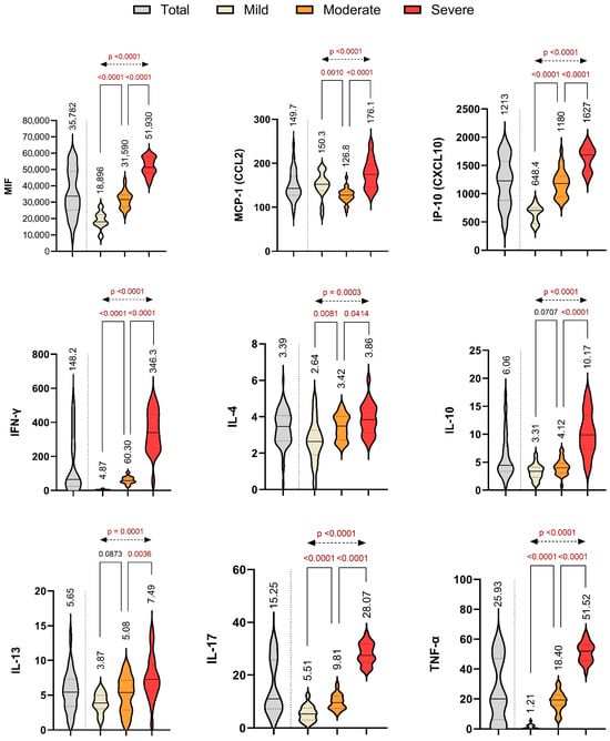 Baseline serum cytokine levels and inflammatory markers among patients stratified by disease severity. Violin plots illustrate the distribution of MIF, MCP-1, IP-10, IFN-γ, IL-4, IL-10, IL-13, IL-17, and TNF-α across the three severity groups at baseline. Median values are indicated, and intergroup comparisons are annotated with significance levels (p values). Statistical analysis was performed using one-way ANOVA for continuous variables with Tukey’s HSD post hoc test, and Chi-square test for categorical variables, with Fisher’s exact test and Bonferroni correction applied to pairwise comparisons (α = 0.0167).