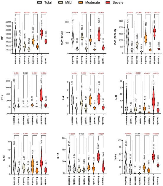 Longitudinal changes in cytokine and inflammatory marker concentrations at 1-month follow-up compared to baseline. Paired violin plots illustrate reductions in MIF, MCP-1, IP-10, IFN-γ, IL-4, IL-10, IL-13, IL-17, and TNF-α over time in the entire cohort and within each severity group. Statistical comparisons show significant post-treatment decreases across most markers.