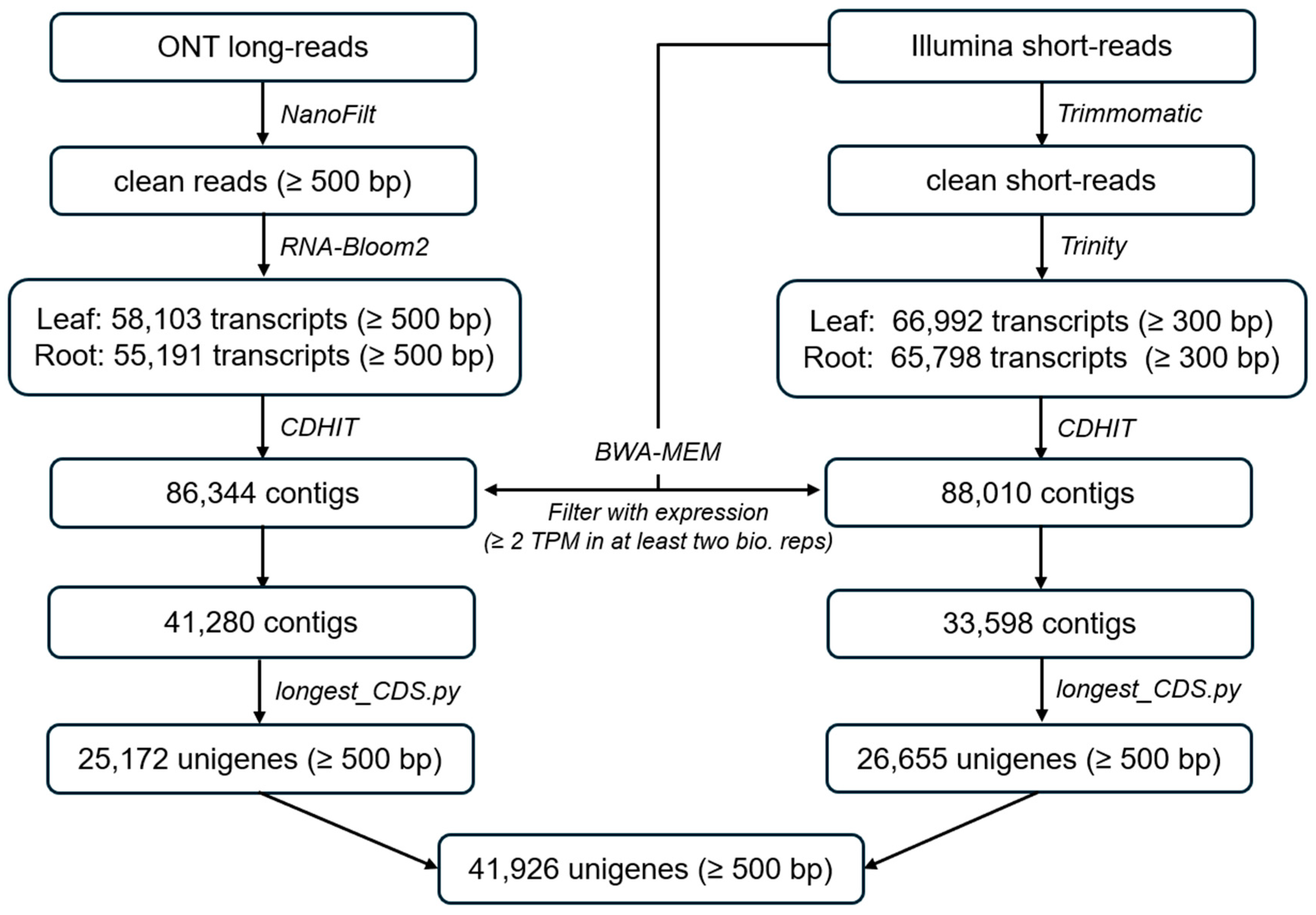 We leveraged the complementary strengths of ONT and Illumina sequencing to assemble a robust leaf and root transcriptome for C. trifolia. ONT sequencing provides long reads capable of capturing full-length transcripts, but its relatively high error rate can pose challenge for accurate transcript reconstruction. In contrast, Illumina short read sequencing offers high coverage and low error rate, providing a valuable complement to ONT data. Therefore, in this study, we analyzed the leaf and root transcriptomes of C. trifolia using both ONT and Illumina sequencing to leverage the strengths of each technology.