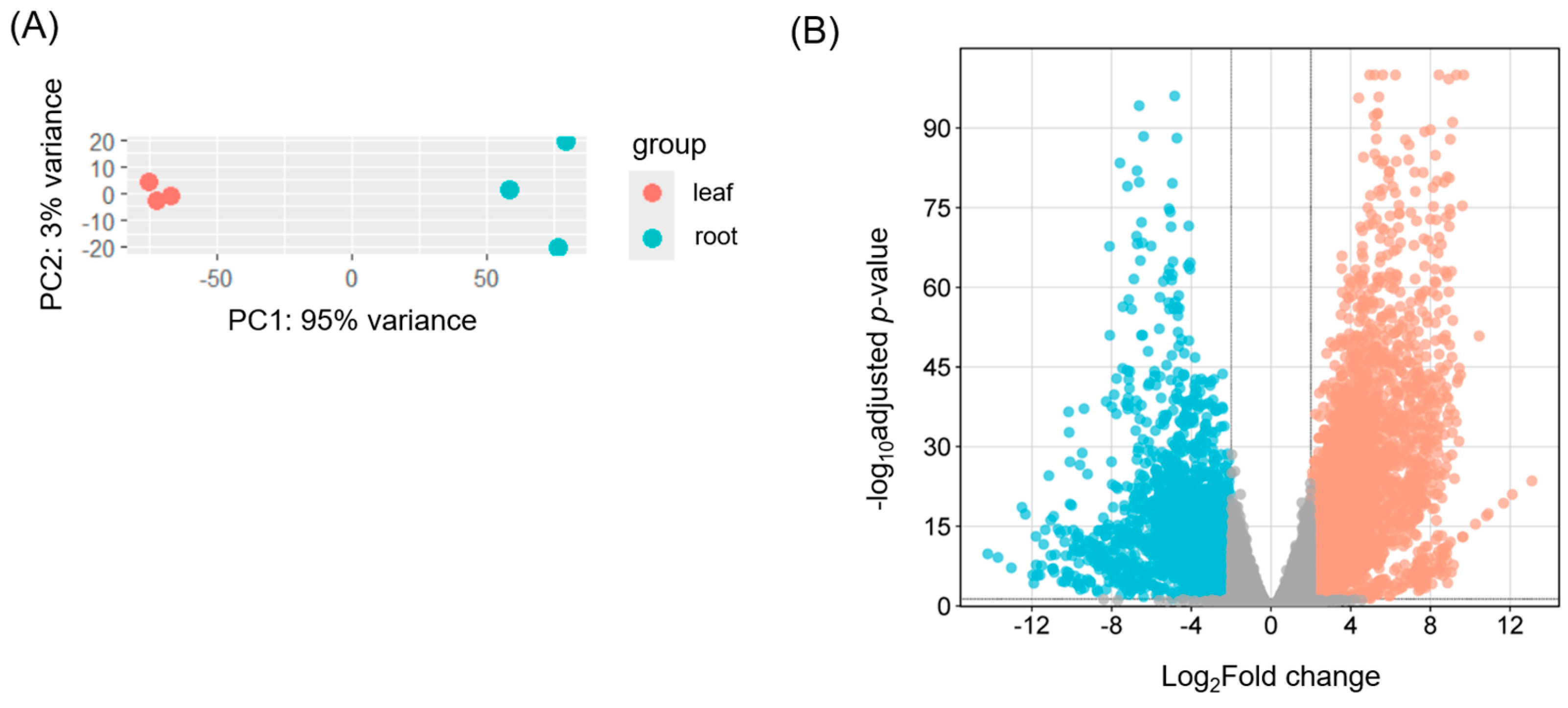 Figure 2. Transcriptome profiles in leaf and root tissues. (A) Principal Component Analysis (PCA) score plot of transcriptome profiles. (B) Volcano plot of differentially expressed transcripts. Orange and cyan dots indicate transcripts more abundant in leaf and root tissues, respectively, compared to the other tissue. Gray dots indicate no differential expression between the two tissues. The cutoff criteria were set at |log2 fold change| ≥ 2 with an adjusted p-value < 0.05.
