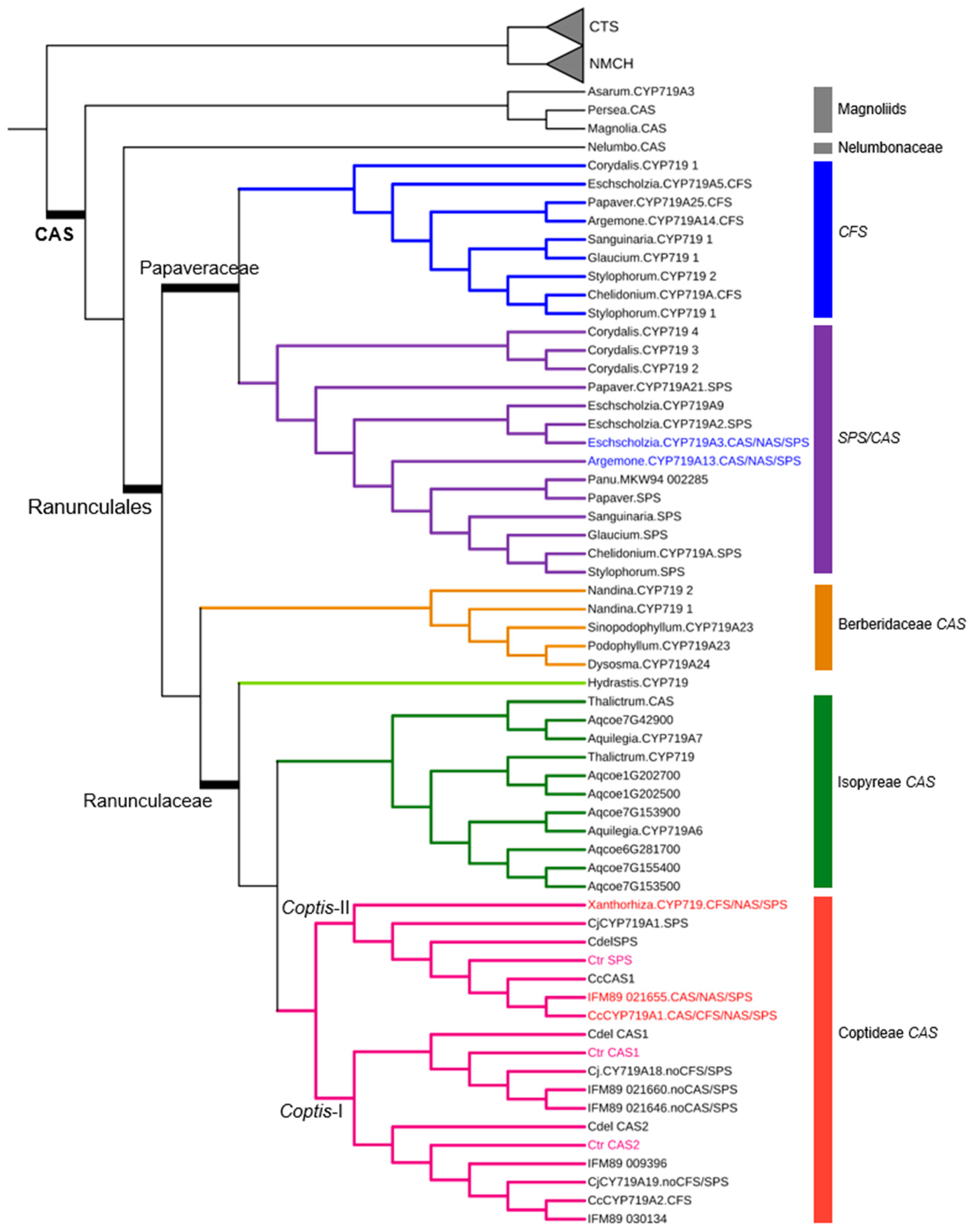 Figure 3. Neighbor-Joining (NJ) tree of CAS gene homologs. CTS and NMCH sequences were used as outgroups. CAS gene homologs from C. trifolia are shown in pink. In the phylogenetic tree, blue and purple lines represent CFS and SPS/CAS of Papaveraceae, respectively, while orange lines indicate CAS of Berberidaceae. Light green, green, and magenta lines correspond to the Hydrastis CYP719 sequence, and CAS of Isopyreae and Coptideae, respectively. Genes with multifunctional CAS/NAS/SPS or CAS/CFS/NAS/SPS activities are highlighted in blue and red, respectively. The information of sequences used in tree construction are provided in Table S3.