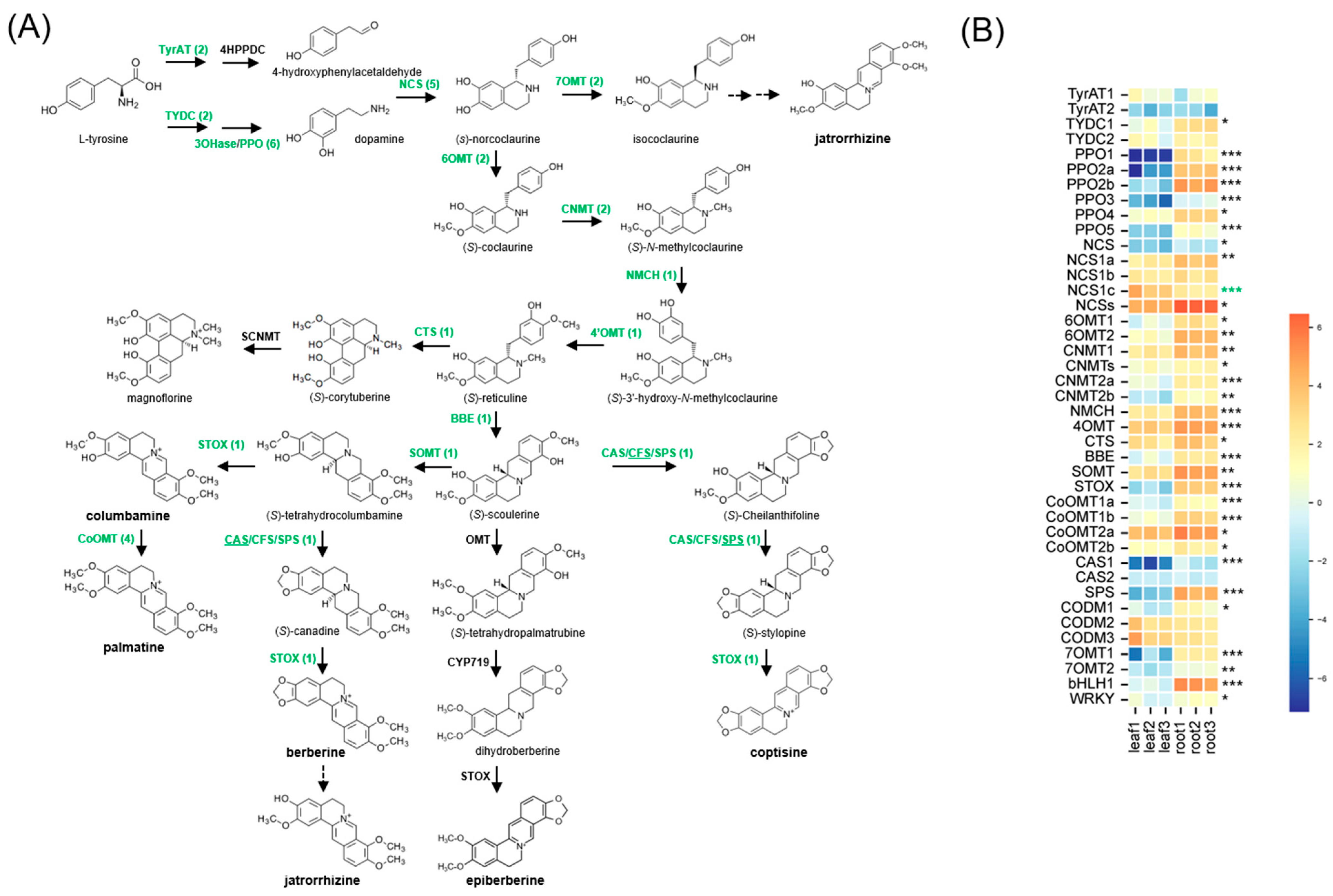 Figure 4. Putative biosynthetic pathways of BIA in Coptis species (A) and expression patterns of putative BIA biosynthetic genes (B). In the pathway diagram, enzymes identified from C. trifolia are shown in green text, with the number of gene homologs indicated in parentheses. Metabolites targeted for profiling are highlighted in bold. Underlined genes are putatively responsible for catalyzing the reaction. In the heatmap, gene expression values are log2-transformed TPM. Asterisks indicate significantly higher gene expression in roots (black) or leaves (green), with significance levels denoted as adjusted p < 0.05 (*), p < 0.01 (**), and p < 0.001 (***).