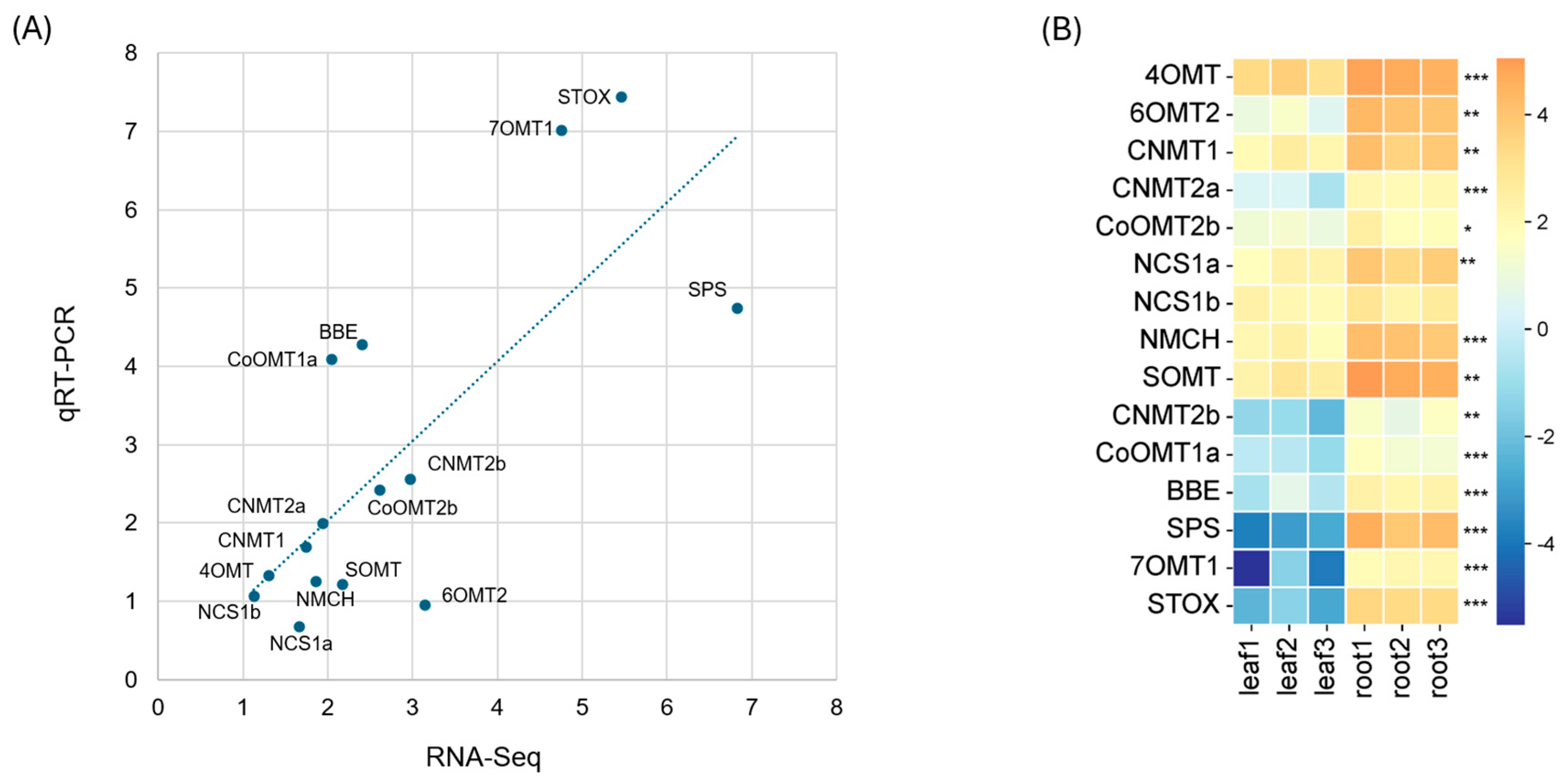 Figure 5. Validation of RNA-Seq results using 15 selected BIA biosynthetic genes. (A) Correlation between RNA-Seq and qRT-PCR results based on log2-fold changes between leaf and root samples. (B) Heatmap of RNA-Seq data showing log2-transformed TPM for selected genes. Asterisks indicate significantly higher gene expression in roots than leaves, with significance levels denoted as adjusted p < 0.05 (*), p < 0.01 (**), and p < 0.001 (***).