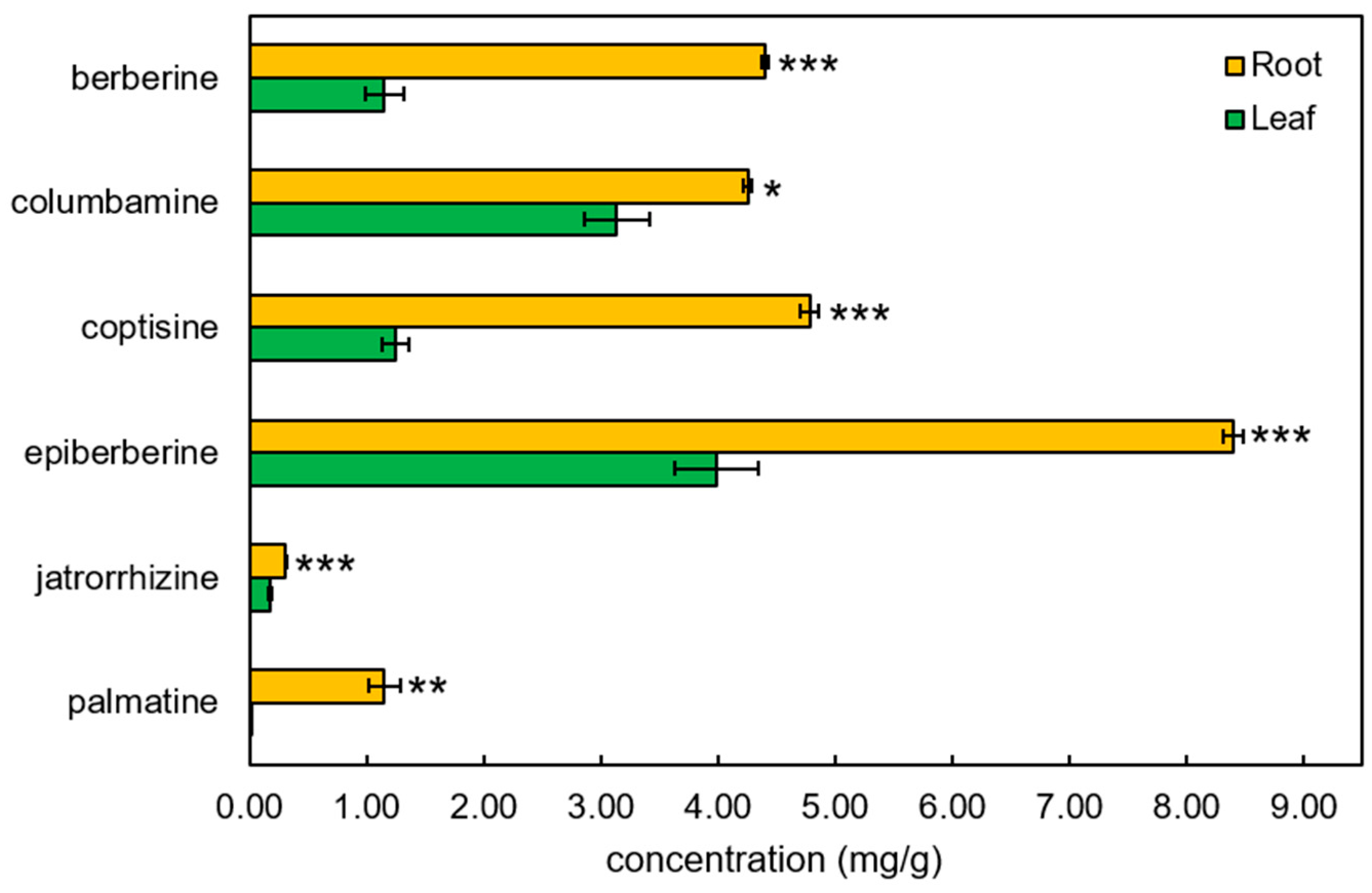 Figure 7. Contents of six BIAs in leaf and root tissues of C. trifolia. Differentially accumulated BIAs between leaf and root samples are indicated by asterisks: p < 0.05 (*), p < 0.01 (**), and p < 0.001 (***) from Student’s t-test. The bar within the box represents the mean ± standard error.