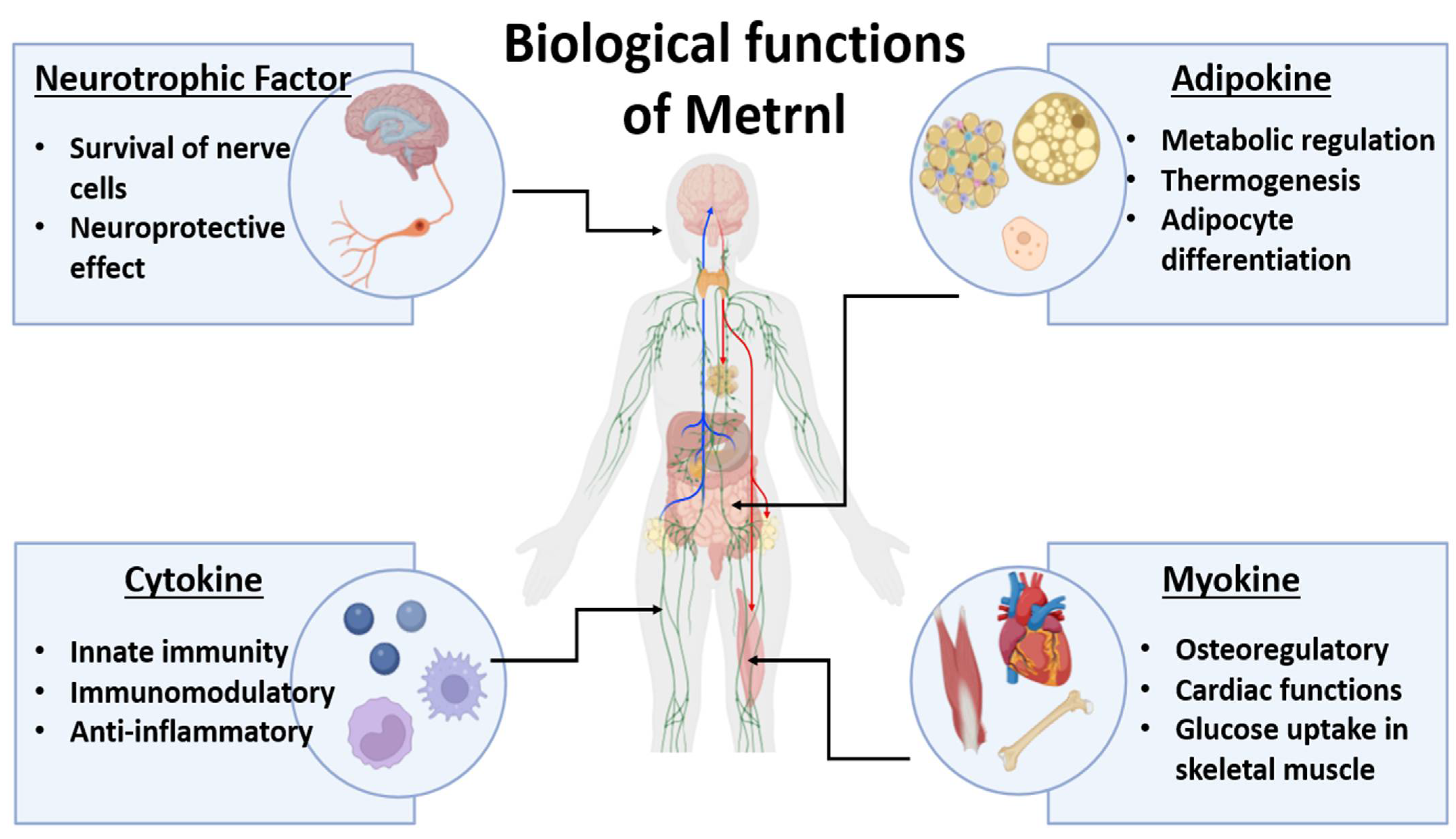- Li, Z.; Gao, Z.; Sun, T.; Zhang, S.; Yang, S.; Zheng, M.; Shen, H. Meteorin-like/Metrnl, a novel secreted protein implicated in inflammation, immunology, and metabolism: A comprehensive review of preclinical and clinical studies. Front. Immunol. 2023, 14, 1098570. [Google Scholar] [CrossRef] [PubMed] [PubMed Central]