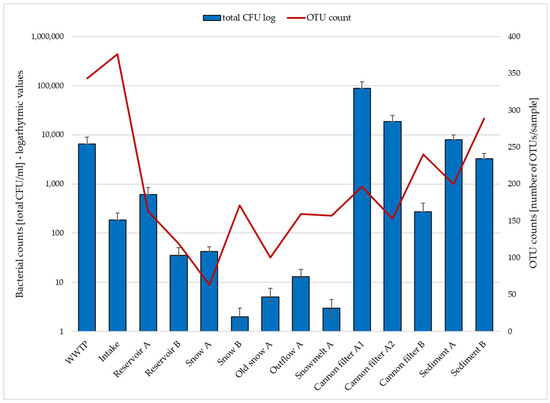 Figure 1 shows total CFU (sum of E. coli, enterococci, coagulase-positive staphylococci, and mesophilic bacteria) as blue bars (log scale, left axis), while OTU counts based on 16S rRNA gene amplicon sequencing are shown as a red line (right axis). Detailed CFU data for individual bacterial groups are provided in Supplementary Table S1. The data (Figure 1, Supplementary Table S1) illustrate the contrast between culture-based and sequencing-based detection, particularly in snow and meltwater samples, where OTUs remain detectable despite low or absent culturable bacteria. This discrepancy reflects the limitations of culture-based methods, which typically capture less than 1% of environmental bacterial diversity [20,21]. Also, attempts to correlate culture-based CFU counts of indicator organisms (e.g., E. coli, Enterococci or Staphylococci) with their relative abundances in the 16S rRNA gene amplicon data revealed no consistent patterns, reflecting fundamental methodological differences between culture-dependent and culture-independent approaches and the potential presence of DNA from non-viable cells. It also supports the value of high-throughput molecular methods such as 16S rRNA sequencing in uncovering the microbial diversity, including viable but non-culturable (VBNC) and dead cells retaining DNA signatures in low-biomass, oligotrophic or stressed environments, like snow. Snow cannon filters and sediment samples exhibit the highest microbial loads in both approaches, highlighting their potential as microbial reservoirs or biofilm-rich sites within the system. Presumably, snow cannons may trap organic debris and provide surfaces for microbial attachment, as well as provide shelter from direct UV light exposure, which is favorable for microbial persistence. Similar observations have been reported in engineered aquatic environments, where biofilm accumulation and particle trapping contribute to increased microbial biomass and diversity [22]. In contrast, the near absence of culturable bacteria in fresh snow and snowmelt suggests harsh environmental elimination, possibly due to freezing, UV exposure, or nutrient scarcity. These factors inhibit the growth of non-adapted taxa but do not preclude their molecular detection, which captures DNA from viable but non-culturable cells and dead cells as well [4,11,19]. This may explain why OTUs are still observed at sites where CFUs are nearly absent.