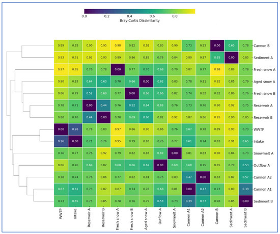 To evaluate compositional similarities between samples, we calculated Bray–Curtis dissimilarities based on the 50 most abundant genera across all samples (Figure 2). The calculated dissimilarity values are very high, suggesting clear variation in bacterial community composition across the technical snowmaking system. However, the highest similarities were observed between WWTP and Intake (dissimilarity = 0.26), two snow cannons A1 and A2 (0.47) and between the two reservoirs (0.44). Cannon A1 also showed moderate similarity to reservoir sediment B (0.39). These patterns suggest that spatial proximity, similar environmental conditions, or shared functions (e.g., anthropogenically impacted water, water retention, biofilm formation and freezing temperatures) can support overlapping microbial assemblages. In contrast, snow-related samples (Fresh Snow A, Fresh Snow B and Aged Snow A) showed high or nearly complete dissimilarity with source waters (e.g., Fresh Snow A vs. WWTP = 0.97; Fresh Snow A vs. Intake = 0.95; Fresh snow B vs. WWTP = 0.86), underscoring the strong selective pressure during the snow formation processes. These patterns align with previous studies showing that technical and environmental filtering, including UV light disinfection, pressurized spraying and water freezing, significantly alter microbial communities in engineered water systems [28,29,30,31]. Overall, these results support the model of progressive microbial selection and restructuring from input waters through snowmaking and deposition. Also the fact that snow and melt samples cluster away from input water sources, support the idea that cold adaptation, desiccation tolerance, and low nutrient availability drive microbial divergence in snow environments [32,33]. Meanwhile, sediment samples retained greater microbial similarity to each other and to cannon filters, likely due to their role as microbial sieves, enriched in particle-associated and biofilm-forming bacteria [34].
