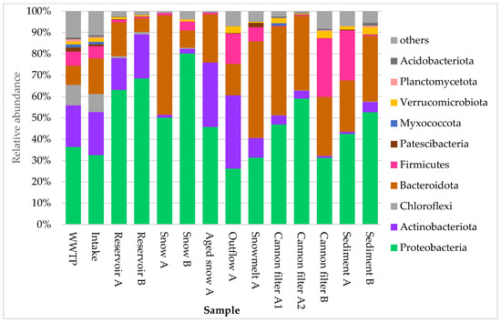 Aged snow displayed a more balanced community composition, with co-dominance of Proteobacteria (45.8%), Actinobacteriota (30.2%), and Bacteroidota (22.6%). These patterns suggest selective survival or accumulation effects within the snowpack over time. In WWTP and Intake water samples, Proteobacteria and Actinobacteriota were most abundant, consistent with their prevalence in urban and freshwater environments. Meanwhile, cannon filters showed high proportions of Bacteroidota and Proteobacteria, while Firmicutes became co-dominant in the Cannon filter B (27.5%), possibly indicating niche adaptation or biofilm formation in response to operational conditions. Finally, sediment samples (A and B) showed mixed phylum-level composition, with notable variation between the two reservoirs.