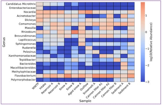 Table 2 and Figure 5 summarize the key genera selected based on their abundance patterns, ecological significance, and known environmental niches. Analysis of their abundance within the examined anthropogenically impacted environment offered a deeper understanding of microbial dynamics and possible effects on further elements of the receiving compartments. Wastewater-associated bacteria such as Candidatus Microthrix and unidentified genera of Enterobacteriaceae family were most abundant by the wastewater treatment plant (WWTP), but nearly absent at downstream sites, indicating their dilution or removal during subsequent stages. The river water intake for technical snowmaking (Intake site) showed a community typical of moderate anthropogenic impact, including Nocardia (9.36%) or potentially pathogenic freshwater opportunists Acinetobacter (5.12%) and biofilm-forming Flavobacterium (7.80%) [24]. Technical reservoirs, which are the subsequent step in technical snow production, appeared to facilitate both attenuation of anthropogenic indicators and enrichment of resilient taxa such as Comamonas, Massilia [40] or Flavobacterium [24], suggesting their dual role as both biological filters and selective habitats for cold-adapted bacteria.