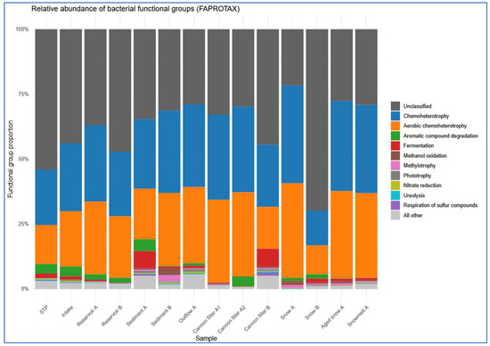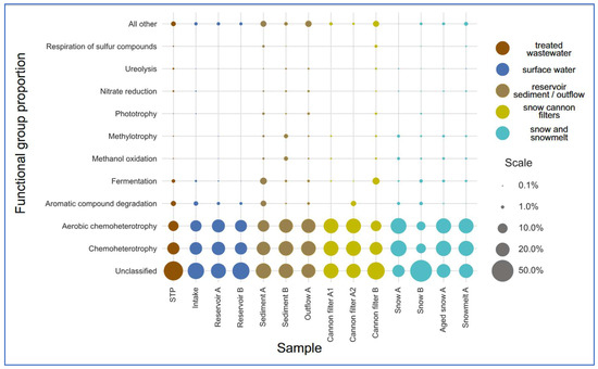 Relative abundance of predicted bacterial functional groups across sample categories, based on FAPROTAX analysis. Samples were grouped into functional stages of technical snow production: wastewater treatment plant (STP), intake water, reservoirs, snow (fresh, aged), snowmelt, cannon filters, outflow, and sediments. The most abundant functions include chemoheterotrophy and aerobic chemoheterotrophy. The category “other” includes less specific or unassigned functions.