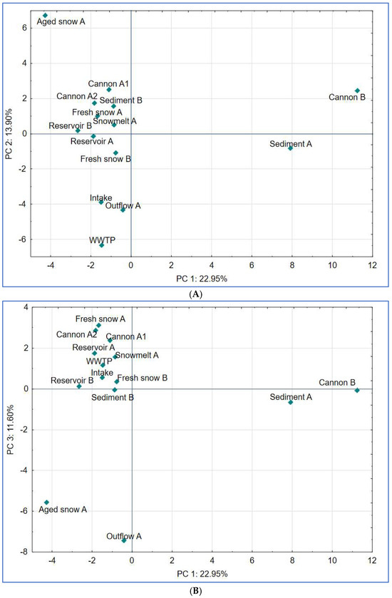 Results of principal component analysis (PCA) based on bacterial community composition at the genus or the closest level across all sampled stages of the examined technical snow production system. (A) PCA plot showing separation along principal components PC 1 and PC 2, which explain 22.95% and 13.90% of the total variance, respectively; (B) PCA plot showing separation along principal components PC 1 and PC 3, explaining 22.95% and 11.60% of the total variance, respectively.