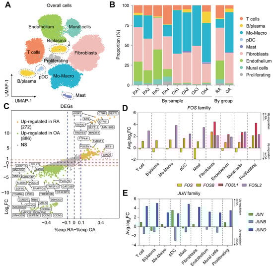 The single-cell landscape and gene expression profiles of the RA and OA synovium. (A) UMAP visualization of 47,672 cells from eight patients, colored by cell types. (B) Stacked bar chart for the proportion of cell types split by sample or by group. (C) Diagonal volcano plot for DEGs between RA and OA. (D) The expression of the FOS families by cell types between RA and OA. (E) The expression of the JUN families by cell types between RA and OA.