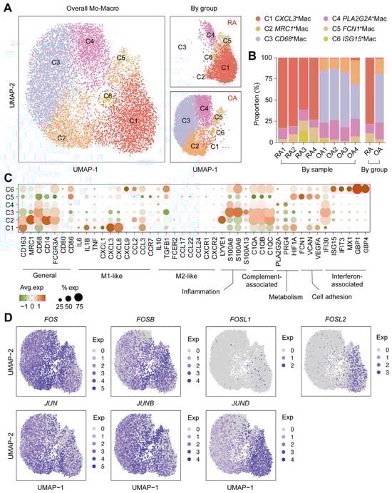 Since monocyte-macrophage lineage is closely associated with activity of RA synovitis [20], we further focused on the macrophage constitution and its expression of the AP-1 family. Thus, we selected the monocyte-macrophage lineage and further subdivided it into six sub-clusters, including CXCL3+Mac (C1), MRC1+Mac (C2), CD68+Mac (C3), PLA2G2A+Mac (C4), FCN1+Mac (C5), and ISG15+Mac (C6) (Figure 2A). Meanwhile, it showed significant divergence between RA and OA; specifically, CXCL3+Mac (C1) was the predominant cluster in the RA synovium, while OA was characterized by MRC1+Mac (C2) and CD68+Mac (C3) (Figure 2A,B). As for the functional genes, CXCL3+Mac (C1) highly expressed some of the M1-like markers (IL1B, IL6, TNF, CXCL1, CXCL3, CXCL8, and CCL3), together with metabolism-associated (PLA2G2A, PRG4, and HIF1A) and intercellular adhesion (VCAN and VEGFA) genes, which suggested that CXCL3+Mac had similar features to pro-inflammatory M1 macrophages. Whereas MRC1+Mac (C2) and CD68+Mac (C3), the predominant cluster of the OA synovium, mainly expressed the complement-associated genes (C1QA, C1QB, C1QC) and IFI30, an interferon-related gene (Figure 2C).