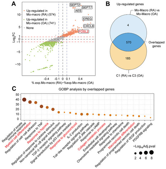 The pathway enrichment of RA synovium. (A) Diagonal volcano plot for DEGs between RA and OA synovial macrophages. (B) Venn diagram showing the overlap between up-regulated DEGs of RA vs. OA macrophages (574) and up-regulated DEGs of C1 (RA) vs. C3 (OA) (755), with 570 overlapping genes. (C) The gene set enrichment of overlapped DEGs on GOBP pathways, with FOSL2-related ones colored in red. Abbreviations: cAMP, cyclic adenosine monophosphate; PDGF, platelet-derived growth factor; TGF-β, transforming growth factor-beta; TNF, tumor-necrosis factor; JNK, c-Jun N-terminal kinase; VEGF, vascular endothelial growth factor.