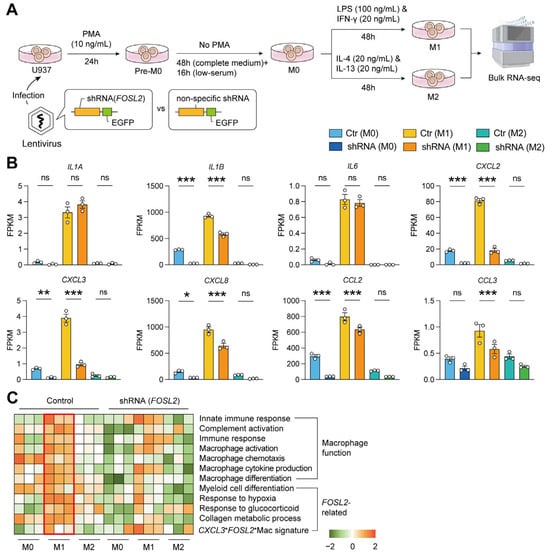 M1/M2 polarization in vitro after knockdown of FOSL2. (A) The workflow of M1/M2 polarization in vitro using U937 cells infected by shRNA-FOSL2-containing lentivirus; (B) The comparisons of M1 markers after knockdown of FOSL2; Statistical significance was determined by one-way ANOVA, *, p < 0.05; **, p < 0.01; ***, p < 0.001; ns, non-significant. (C) The gene set enrichment among shRNA (M0/M1/M2) and control groups, with the red box highlighting the M1 cells without FOSL2 knockdown as the control.