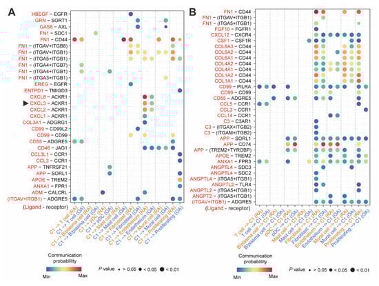 The intercellular communications of CXCL3+FOSL2+Mac (C1). (A) The communication with C1 as the signal transmitter. The arrows indicated CXCL3+FOSL2+Mac communicated with ECs via CXCL3-ACKR1 pair. (B) The communication with C1 as the signal receiver.