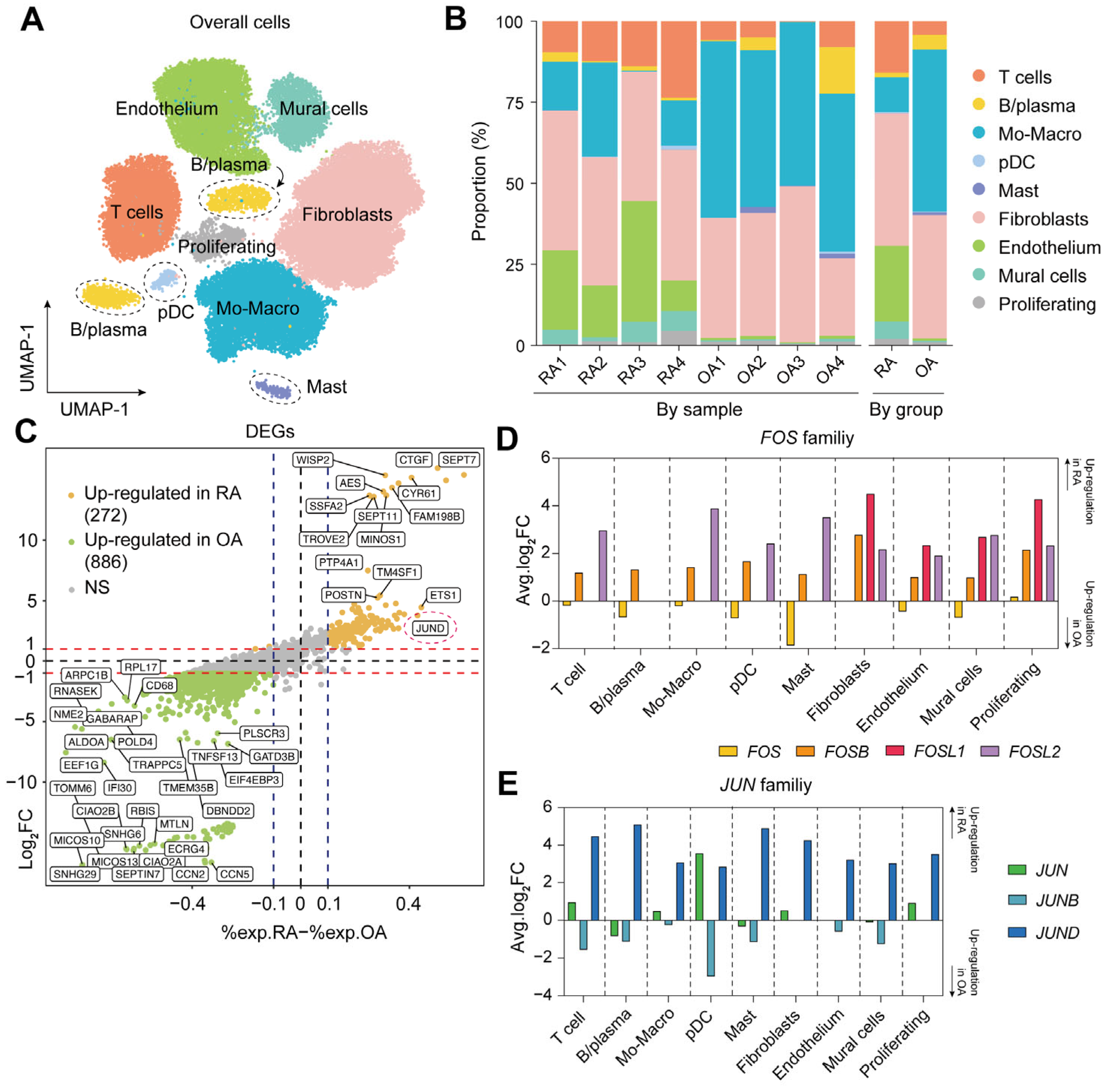 2.2. Elevated Expression of FOSL2 and JUND in RA Synovium