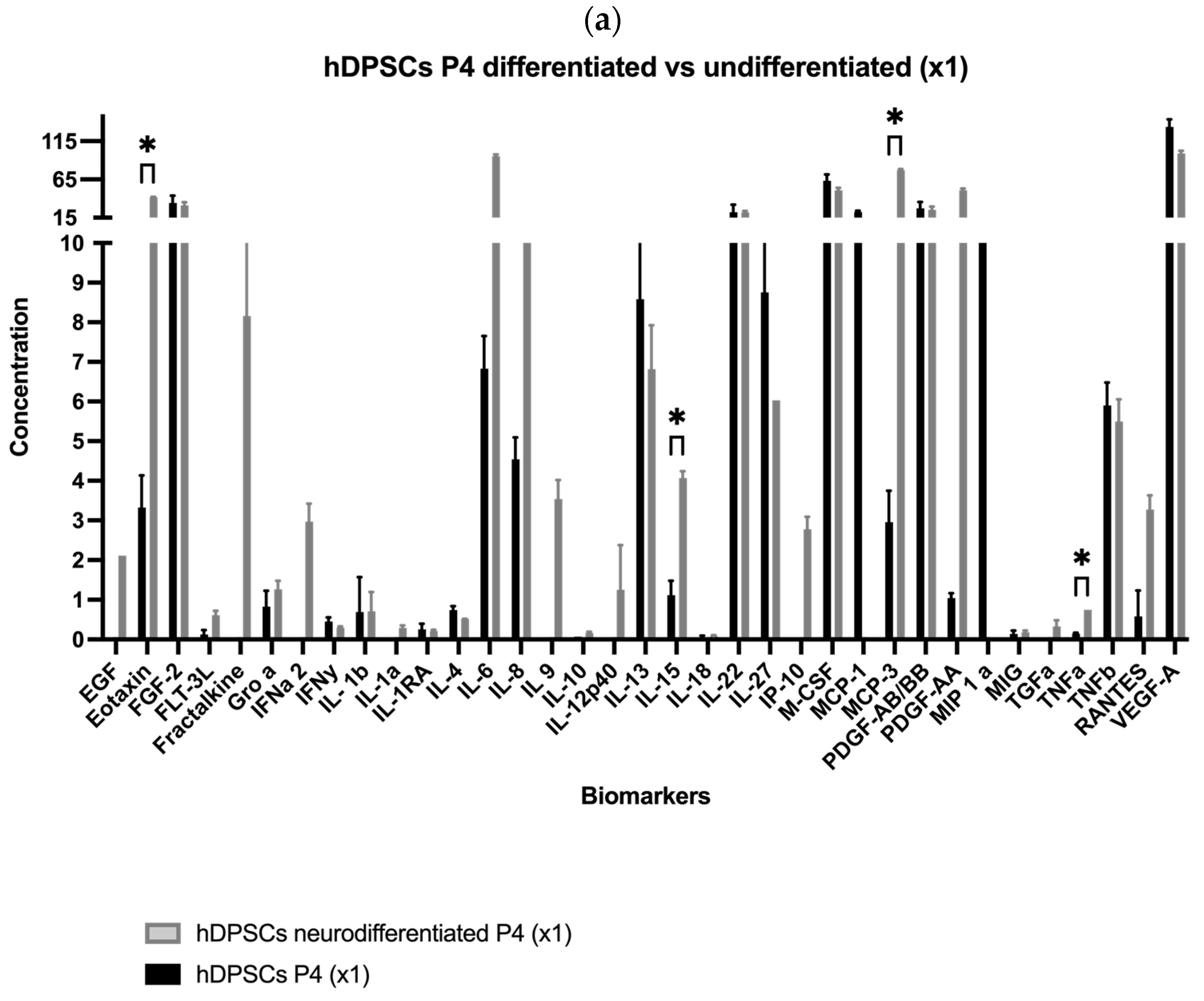 Neurodifferentiated hDPSCs CM P4 | Neurodifferentiated hDPSCs CM P7 | CM hDPSCs P4 | CM hDPSCs P7 | Exosomes hDPSCs P4 | Exosomes hDPSCs P7 | |