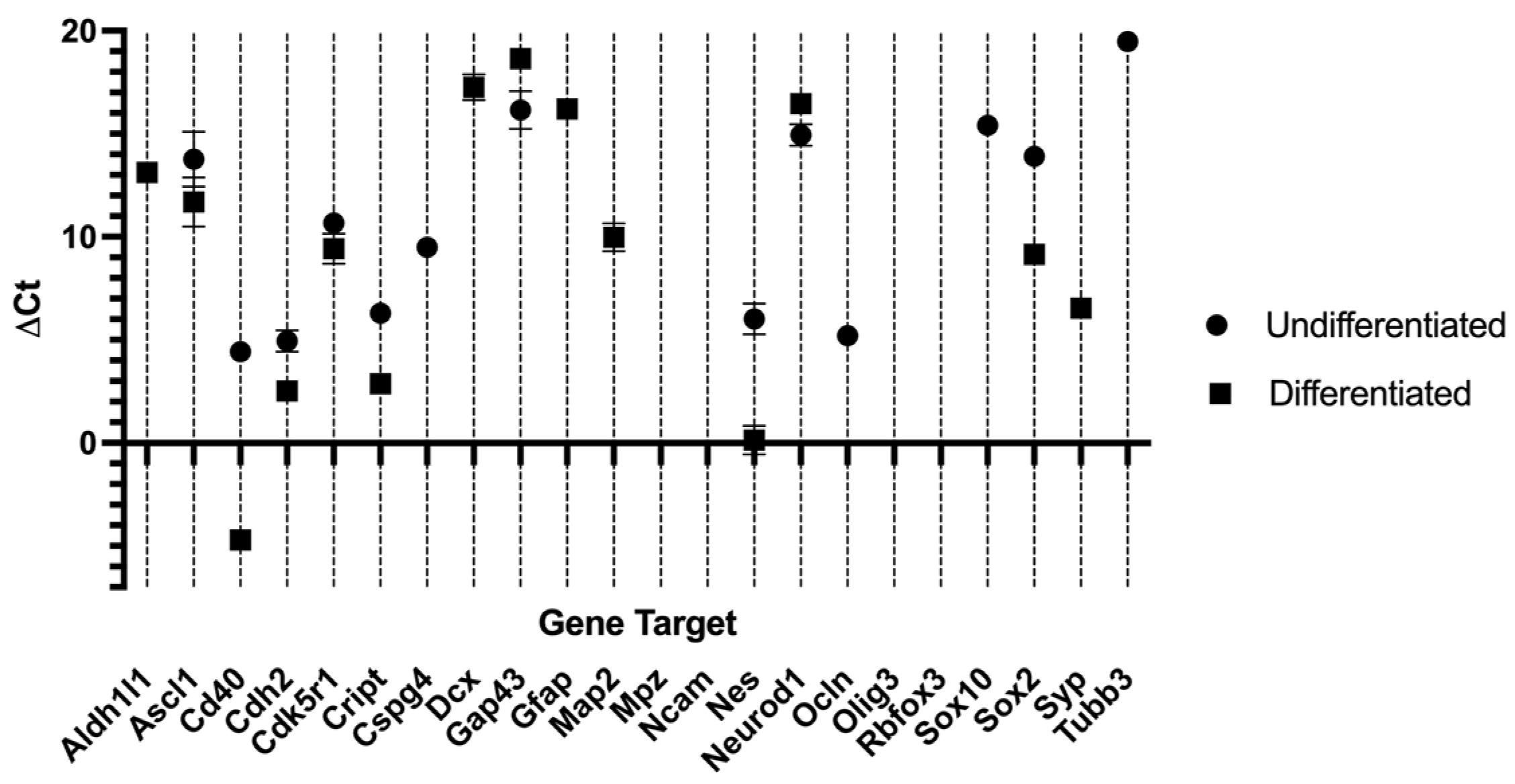 Ascl1 | 35.31 ± 0.00 | 16.01 | 36.41 ± 0.37 | 16.31 | 0.30 | 0.81 | N |