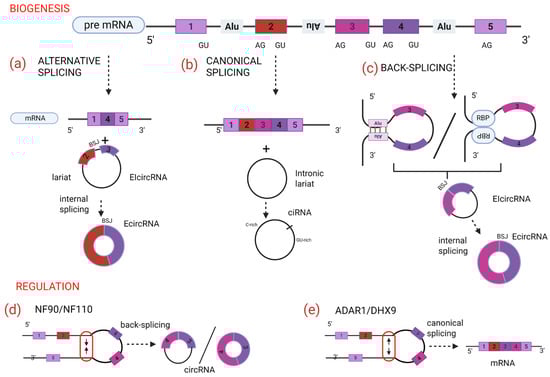 Mechanisms of circRNA biogenesis. Panel (a–c); Biogenesis Regulation. Panel (d,e). Panel (a) Alternative splicing: During exon skipping, the lariat containing the excised exons may undergo internal splicing. This can lead to the formation of an Exon circRNAs (EcircRNA). Panel (b) Canonical splicing: the excised intronic lariat can escape enzymatic degradation and form an intronic circRNA (ciRNA). Panel (c) Backsplicing: This mechanism can be facilitated by repeated intronic sequences and/or dimerizing RBPs, leading to the formation of circRNAs with variable composition (EIcircRNA). Panel (d) The formation of circRNAs can be promoted by RNA-binding factors that can stabilize circularization (NF90/NF110); panel (e) Other factors (ADAR1/DHX9) destabilize the duplex, promoting canonical splicing and mRNA formation. (Created with BioRender.com). ADAR1: adenosine deaminase acting on RNA; BSJ: Back-splice junction; ciRNA: intronic circRNA; circRNA: circular RNA; DHX9: ATP-dependent RNA helicase A; EIcircRNA: exon-intron circRNA; EcircRNA: exon circRNA; RBP: RNA binding protein.