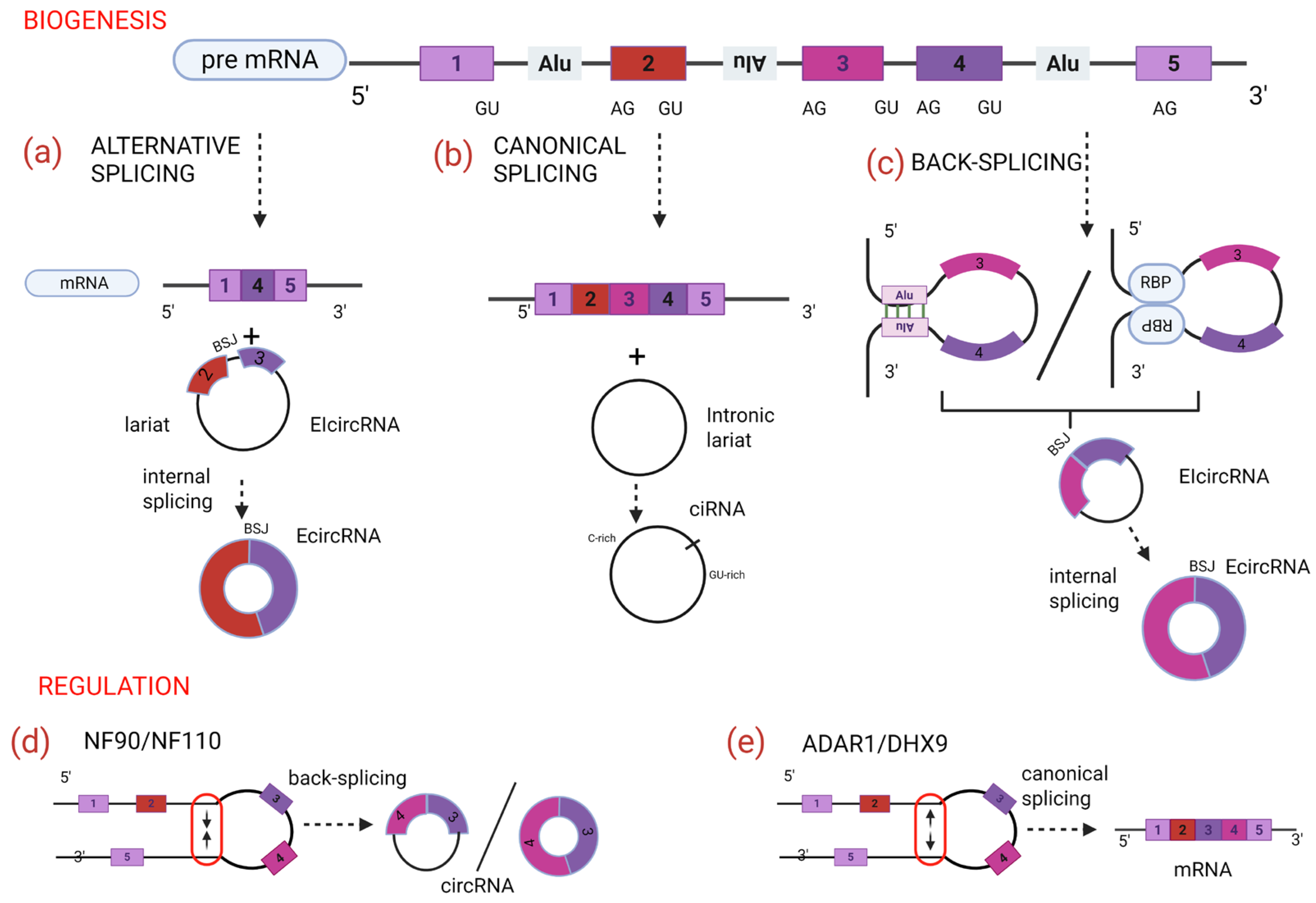 - Intronic circRNAs (ciRNAs) originate exclusively from intronic sequences and are generally less abundant and less stable than ecircRNAs. Their formation and stability rely on specific sequence motifs located near the branch point, such as a GU-rich element close to the 5′ site and a C-rich region near the branch point, which inhibit enzymatic debranching and facilitate the maintenance of the circular structure. ciRNAs predominantly accumulate in the nucleus, where they play a role in cis regulation of transcription [15].