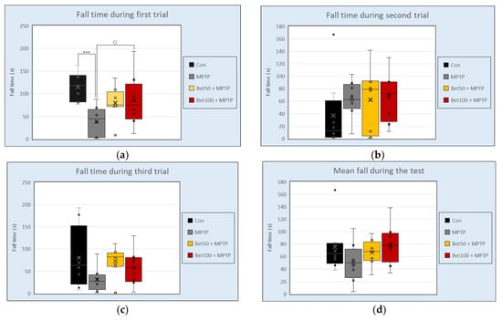 Falling time (s) during three attempts (a–c) and mean falling time (s). (d) in Rota Rod test for control group (Con, n = 8), animals treated with MPTP alone (MPTP, n = 8), and betanin with MPTP (Bet50 + MPTP, n = 8; Bet100 + MPTP, n = 8). *** vs. Con, p < 0.005 (NK); ○ MPTP vs. Bet100 + MPTP, p < 0.05 (NIR). Horizontal line—median, x—mean.